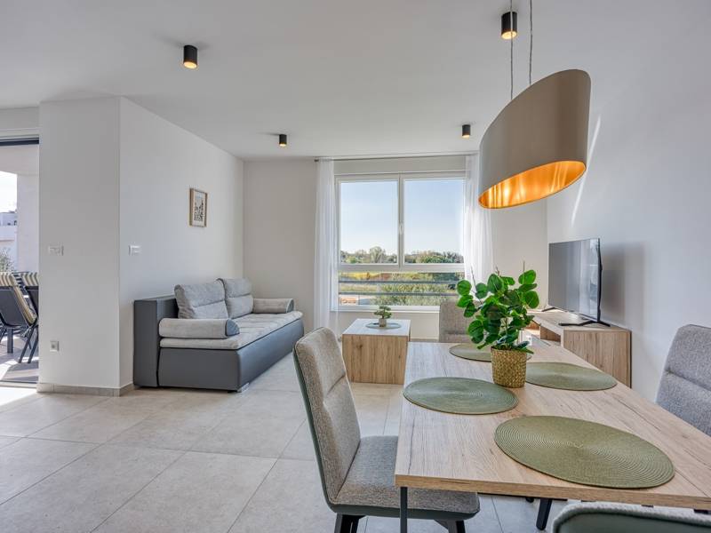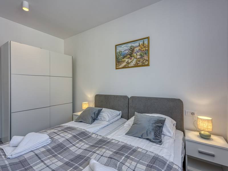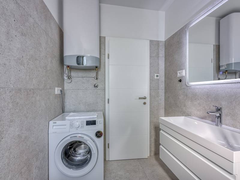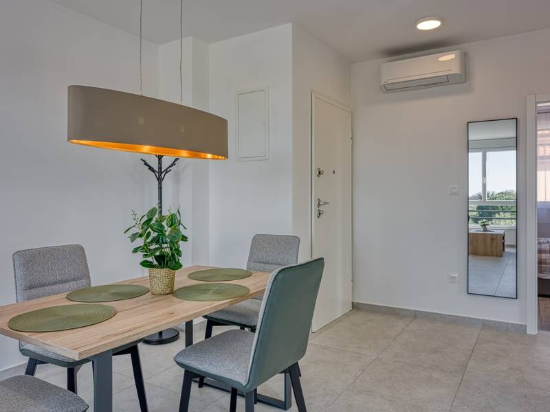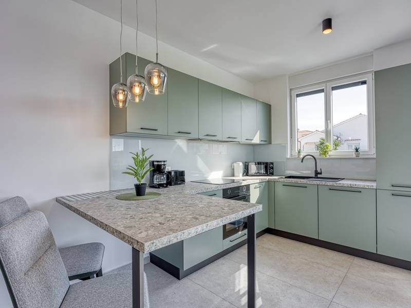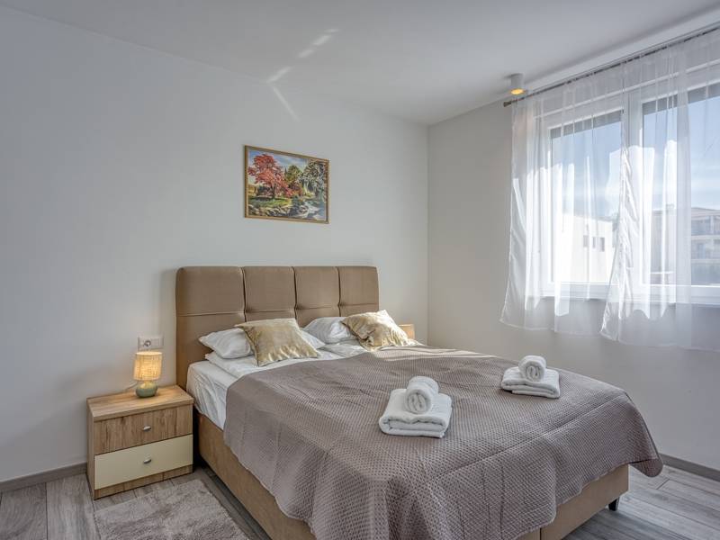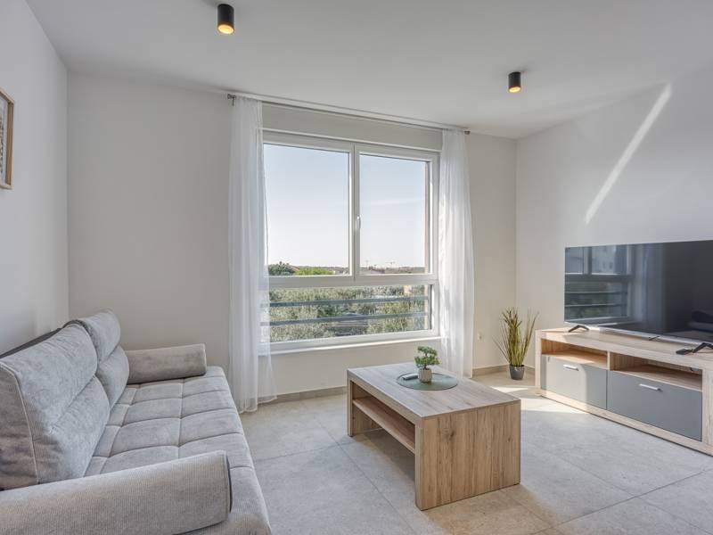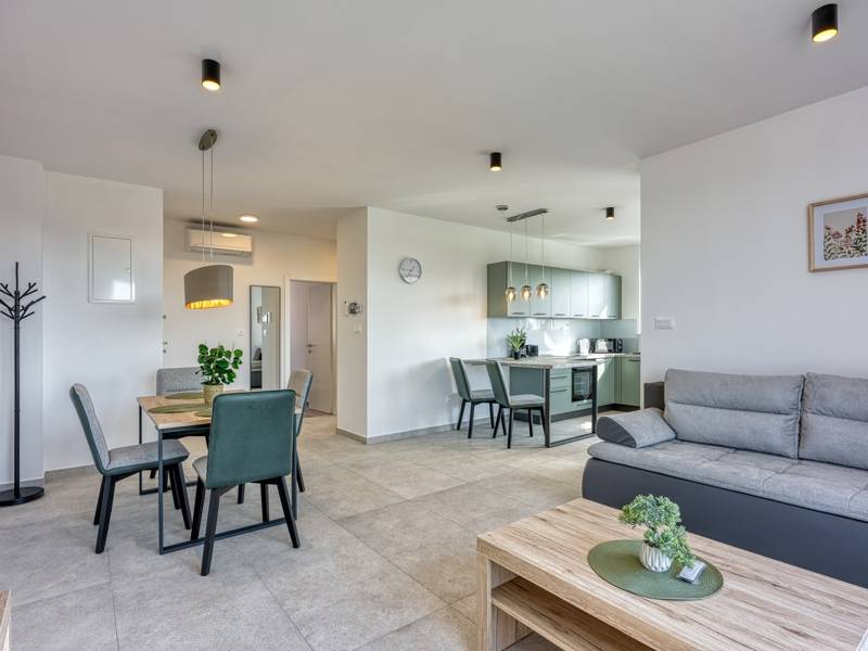 This modern and comfortably furnished apartment is located in a newly built apartment house (2nd floor), ideal for a family vacation or a group of friends. The apartment consists of a spacious living room with a fully equipped kitchen equipped with all necessary appliances and amenities, and the balcony provides additional comfort and the opportunity to enjoy the fresh air, with a view of the city and the sea in the distance.The apartment has 2 comfortable bedrooms that guarantee quality sleep and privacy and one bathroom. For additional comfort, guests have a washing machine at their disposal, and a private parking lot in front of the building allows for carefree parking.This apartment is the perfect place to relax, and its modernity, functionality and comfort make it an excellent choice for all those who want to enjoy a peaceful environment, and yet be close to all the necessary amenities.