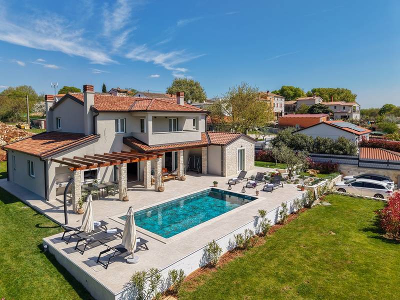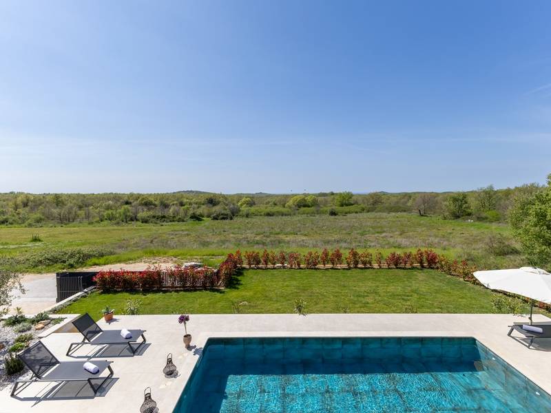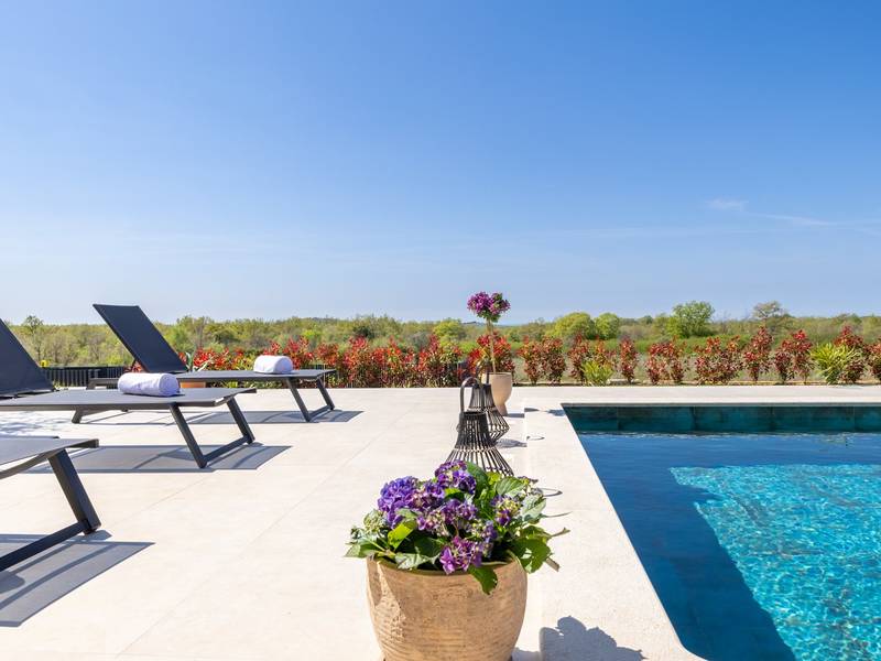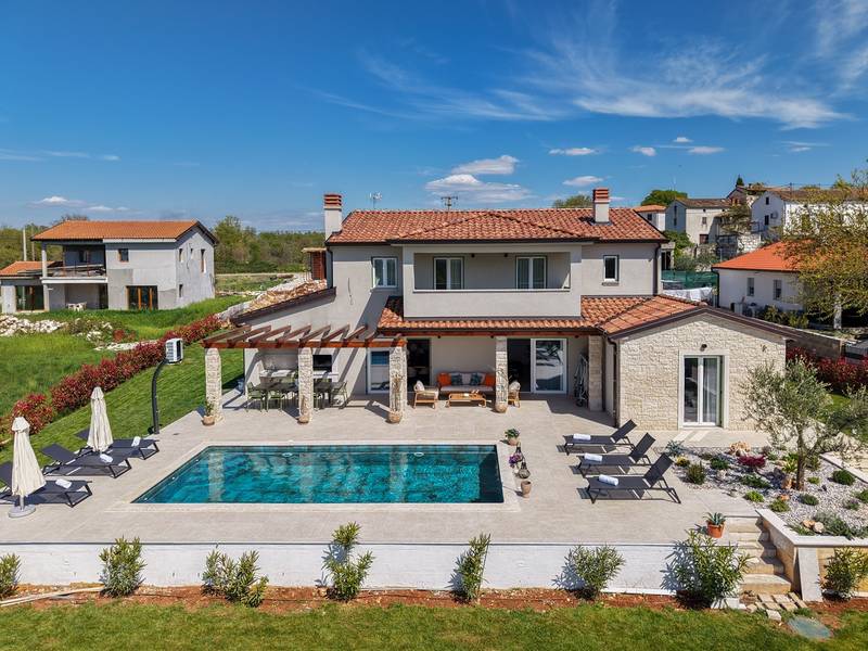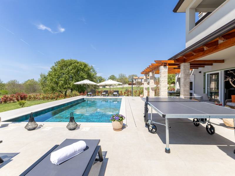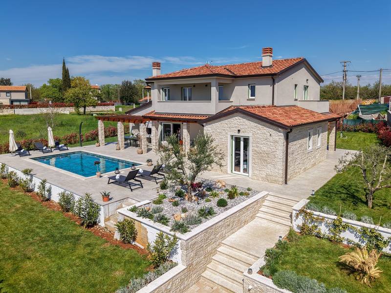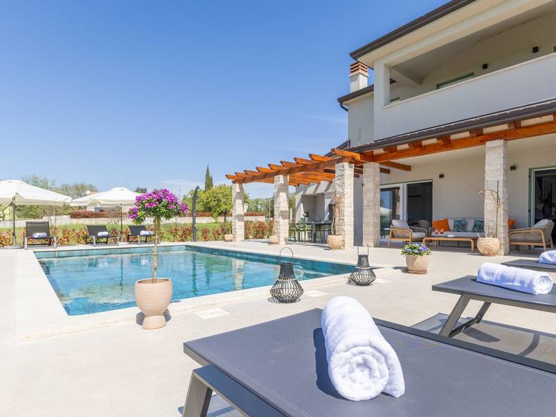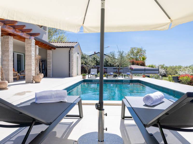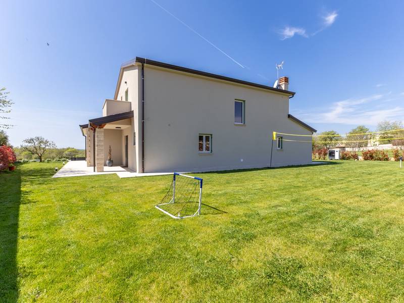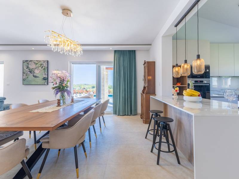 Located in the quiet village of Kirmenjak, in the immediate vicinity of Poreč, this modern and elegant holiday home is the perfect choice for a relaxing stay in Istria. Surrounded by greenery and nature, it offers complete peace, privacy and enchanting views, especially during unforgettable sunsets. The house is designed with an emphasis on comfort and functionality and can accommodate up to eight people. It has four spacious bedrooms, each with its own en suite bathroom, which ensures maximum privacy for all guests. The interior is modernly decorated and fully equipped, and the spacious living room connected to the dining room and modern kitchen makes a central gathering place.The house is especially valuable for its children's playroom, ideal for families with children, as well as the outdoor area, which has been carefully arranged for outdoor enjoyment. In front of the house is a large private swimming pool (32 m2) surrounded by deck chairs and a sunbathing area, perfect for refreshing during warm summer days. Private parking is also available to guests, and the entire property exudes the harmony of modern design and natural surroundings.This holiday home is the ideal choice for anyone looking for a combination of luxury, comfort and authentic Istrian ambience, just a few minutes' drive from the sea and the picturesque centre of Poreč.