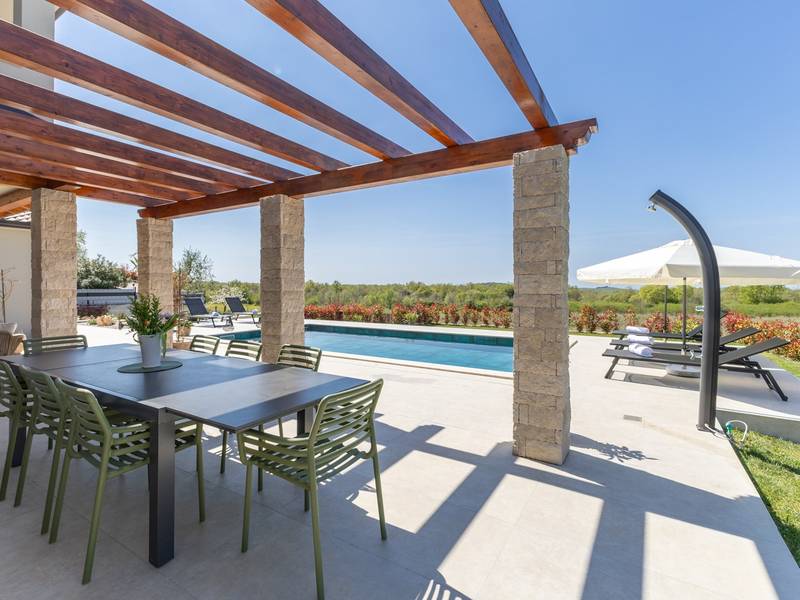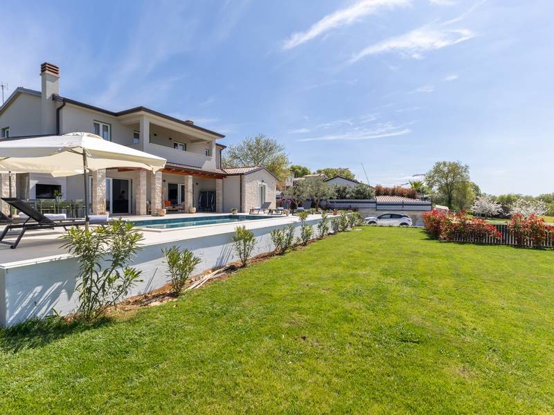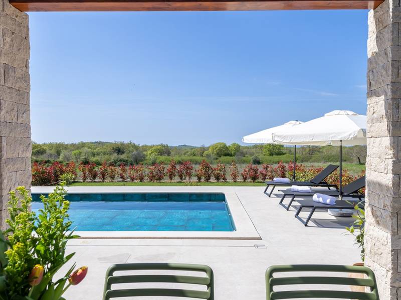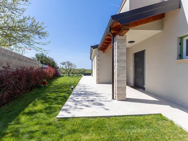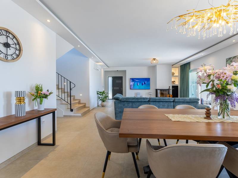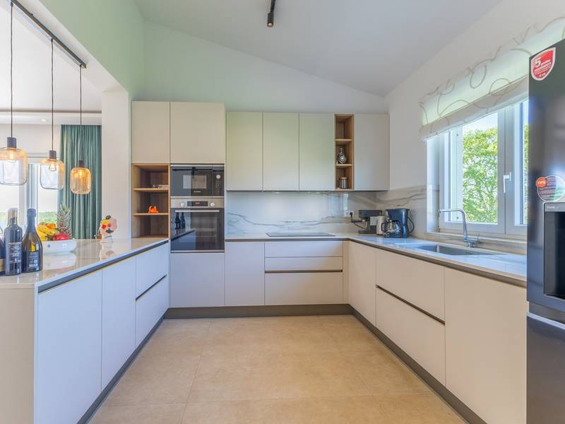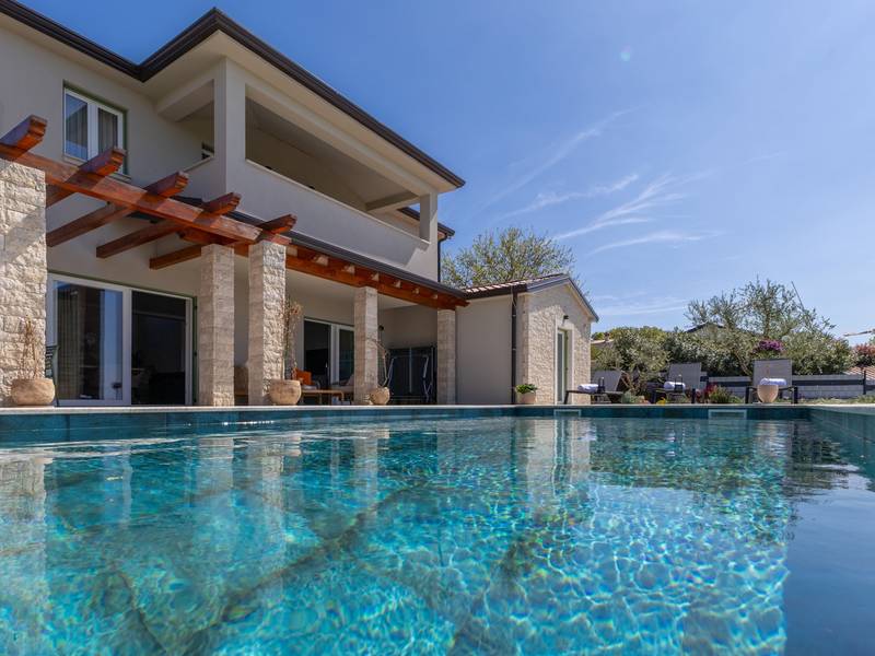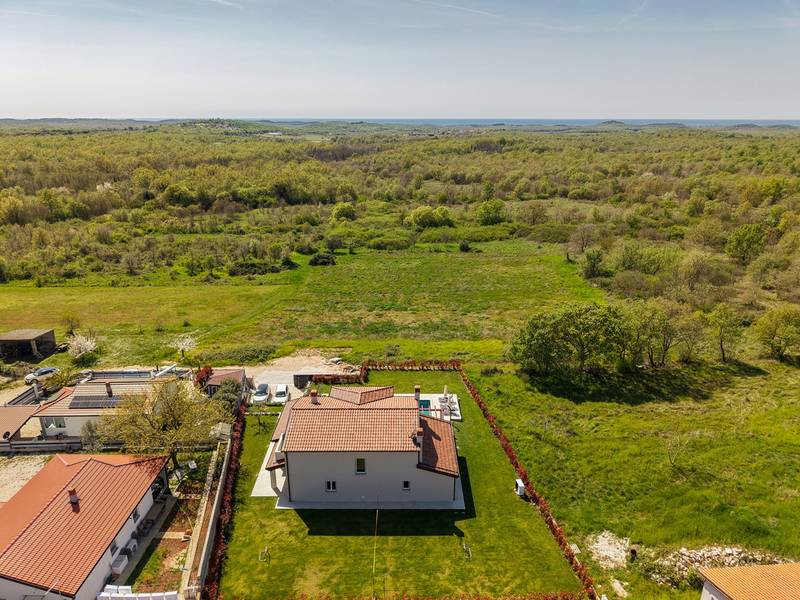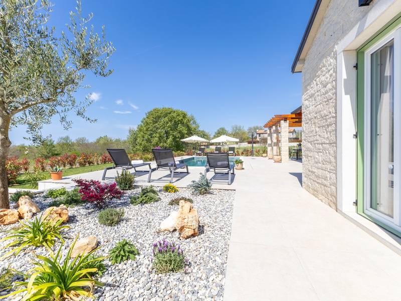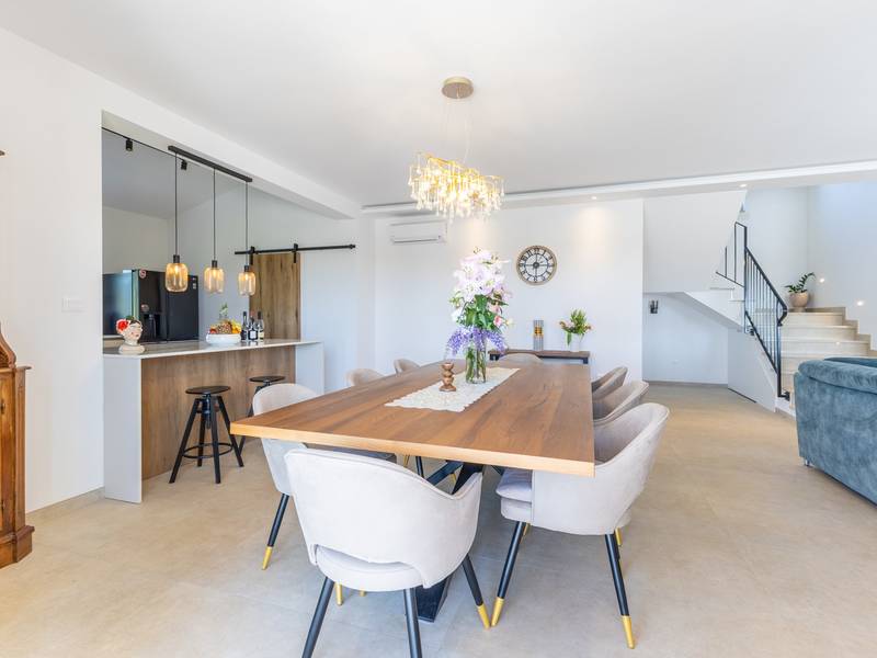 Located in the quiet village of Kirmenjak, in the immediate vicinity of Poreč, this modern and elegant holiday home is the perfect choice for a relaxing stay in Istria. Surrounded by greenery and nature, it offers complete peace, privacy and enchanting views, especially during unforgettable sunsets. The house is designed with an emphasis on comfort and functionality and can accommodate up to eight people. It has four spacious bedrooms, each with its own en suite bathroom, which ensures maximum privacy for all guests. The interior is modernly decorated and fully equipped, and the spacious living room connected to the dining room and modern kitchen makes a central gathering place.The house is especially valuable for its children's playroom, ideal for families with children, as well as the outdoor area, which has been carefully arranged for outdoor enjoyment. In front of the house is a large private swimming pool (32 m2) surrounded by deck chairs and a sunbathing area, perfect for refreshing during warm summer days. Private parking is also available to guests, and the entire property exudes the harmony of modern design and natural surroundings.This holiday home is the ideal choice for anyone looking for a combination of luxury, comfort and authentic Istrian ambience, just a few minutes' drive from the sea and the picturesque centre of Poreč.