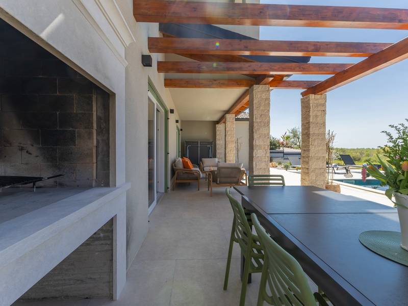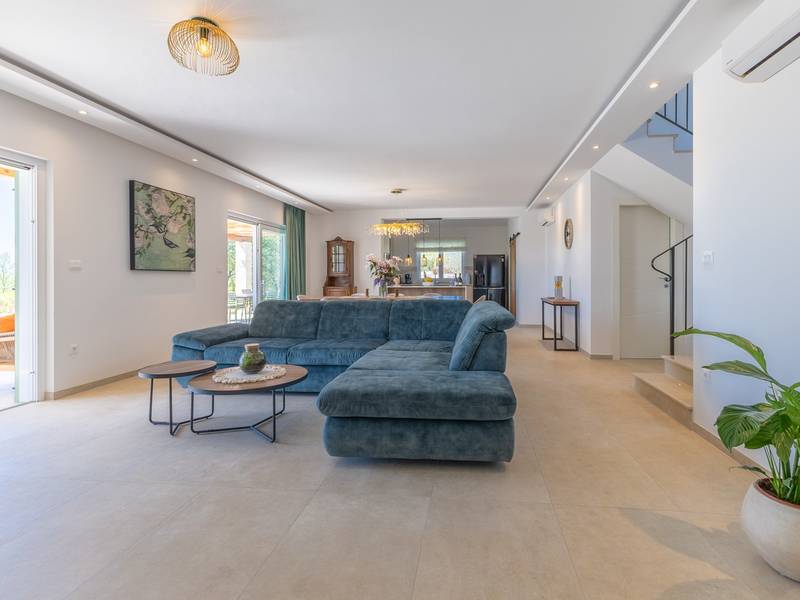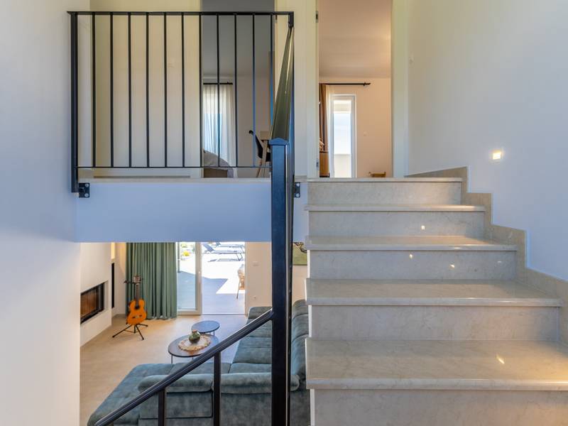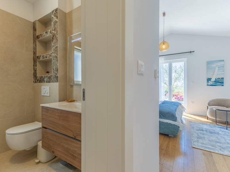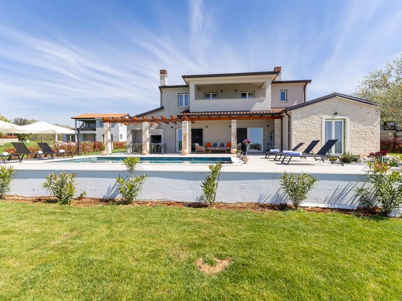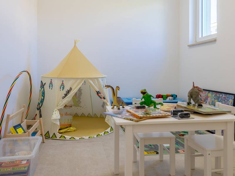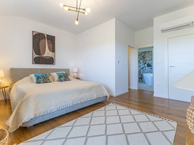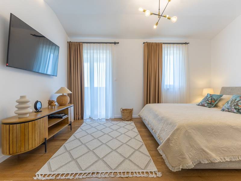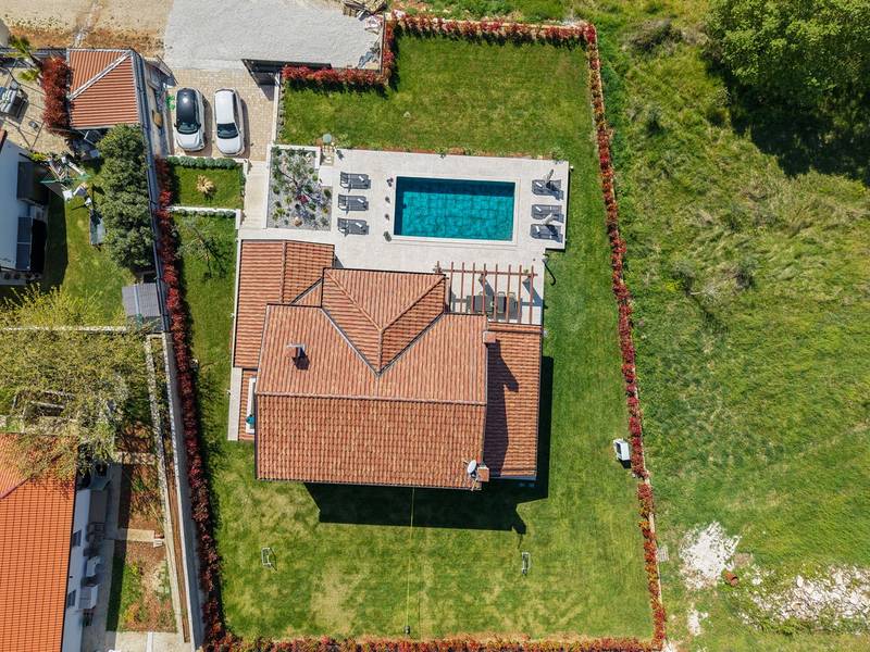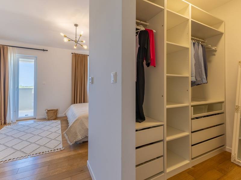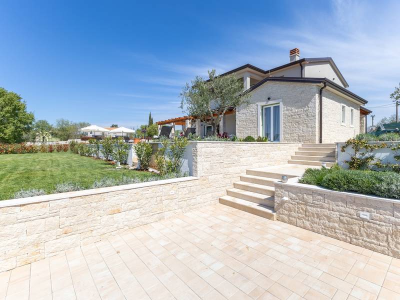 Located in the quiet village of Kirmenjak, in the immediate vicinity of Poreč, this modern and elegant holiday home is the perfect choice for a relaxing stay in Istria. Surrounded by greenery and nature, it offers complete peace, privacy and enchanting views, especially during unforgettable sunsets. The house is designed with an emphasis on comfort and functionality and can accommodate up to eight people. It has four spacious bedrooms, each with its own en suite bathroom, which ensures maximum privacy for all guests. The interior is modernly decorated and fully equipped, and the spacious living room connected to the dining room and modern kitchen makes a central gathering place.The house is especially valuable for its children's playroom, ideal for families with children, as well as the outdoor area, which has been carefully arranged for outdoor enjoyment. In front of the house is a large private swimming pool (32 m2) surrounded by deck chairs and a sunbathing area, perfect for refreshing during warm summer days. Private parking is also available to guests, and the entire property exudes the harmony of modern design and natural surroundings.This holiday home is the ideal choice for anyone looking for a combination of luxury, comfort and authentic Istrian ambience, just a few minutes' drive from the sea and the picturesque centre of Poreč.