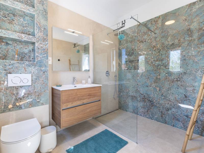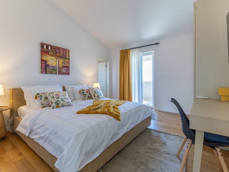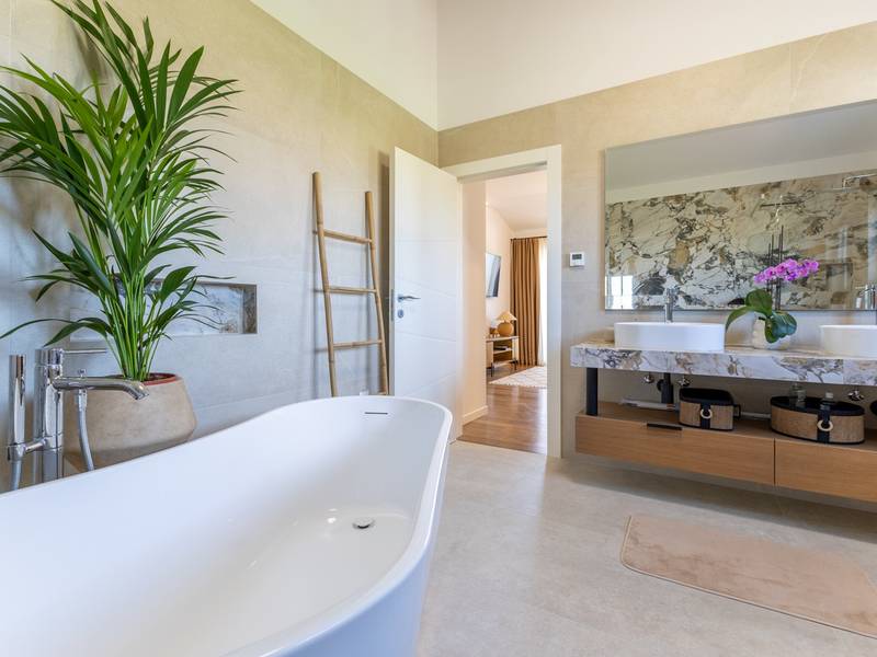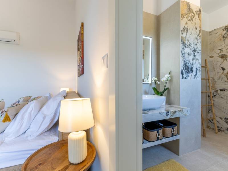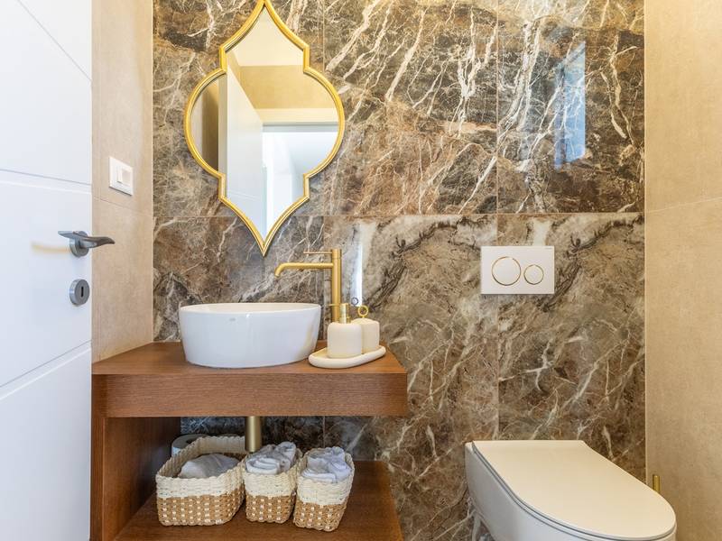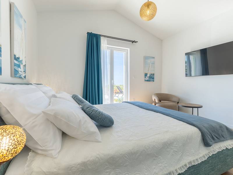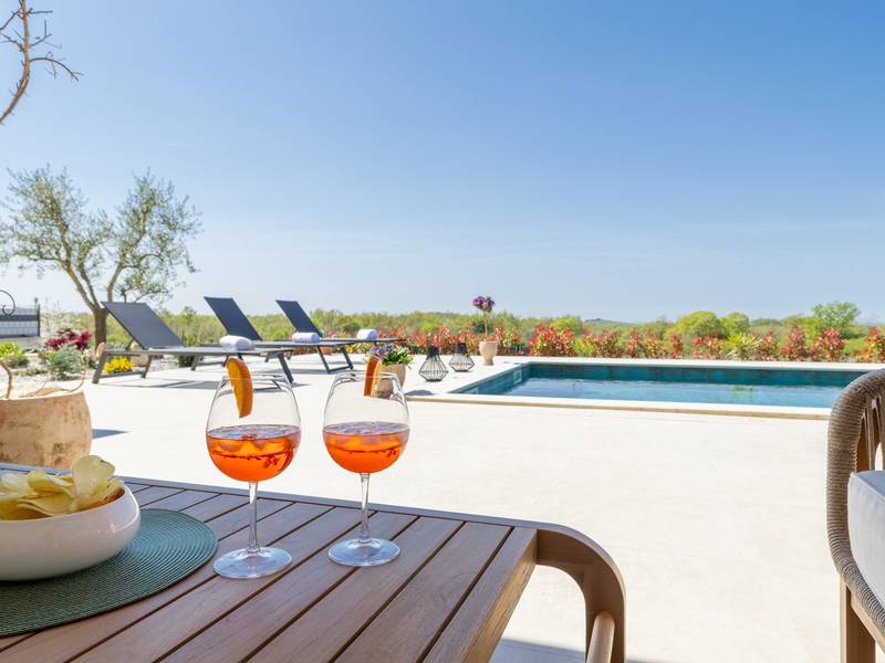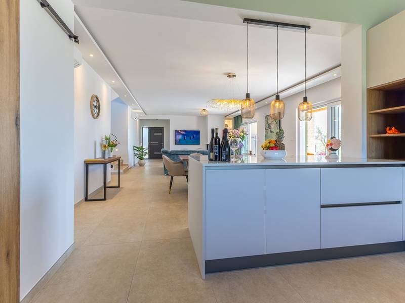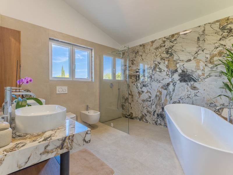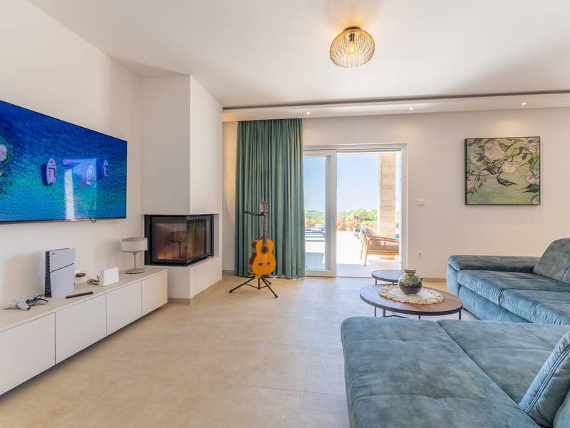 Located in the quiet village of Kirmenjak, in the immediate vicinity of Poreč, this modern and elegant holiday home is the perfect choice for a relaxing stay in Istria. Surrounded by greenery and nature, it offers complete peace, privacy and enchanting views, especially during unforgettable sunsets. The house is designed with an emphasis on comfort and functionality and can accommodate up to eight people. It has four spacious bedrooms, each with its own en suite bathroom, which ensures maximum privacy for all guests. The interior is modernly decorated and fully equipped, and the spacious living room connected to the dining room and modern kitchen makes a central gathering place.The house is especially valuable for its children's playroom, ideal for families with children, as well as the outdoor area, which has been carefully arranged for outdoor enjoyment. In front of the house is a large private swimming pool (32 m2) surrounded by deck chairs and a sunbathing area, perfect for refreshing during warm summer days. Private parking is also available to guests, and the entire property exudes the harmony of modern design and natural surroundings.This holiday home is the ideal choice for anyone looking for a combination of luxury, comfort and authentic Istrian ambience, just a few minutes' drive from the sea and the picturesque centre of Poreč.