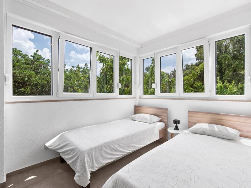 Nicely decorated and comfortable two bedroom apartment Poli Nona with balcony in walking distance to the center of Poreč. The apartment spreads on over 86 m2 and can accomodate up to 4 guests. It is located on the first floor of the family house and consists of a fully equiped kitchen with kitchen utensils and dining area for 4 guests, a comfortable living room with excess to the terrace with sitting area ideal for breakfast, one bedroom with a double bed, one bedroom with two single beds and a bathroom with shower. The entrance to the children room is from the balcony. There is a balcony with garden furniture. The apartment has air conditioning, SAT TV, bed linen and towels, and the guests have a private parking on their disposal. The guests have also a BBQ on in the shared garden on theire disposal.