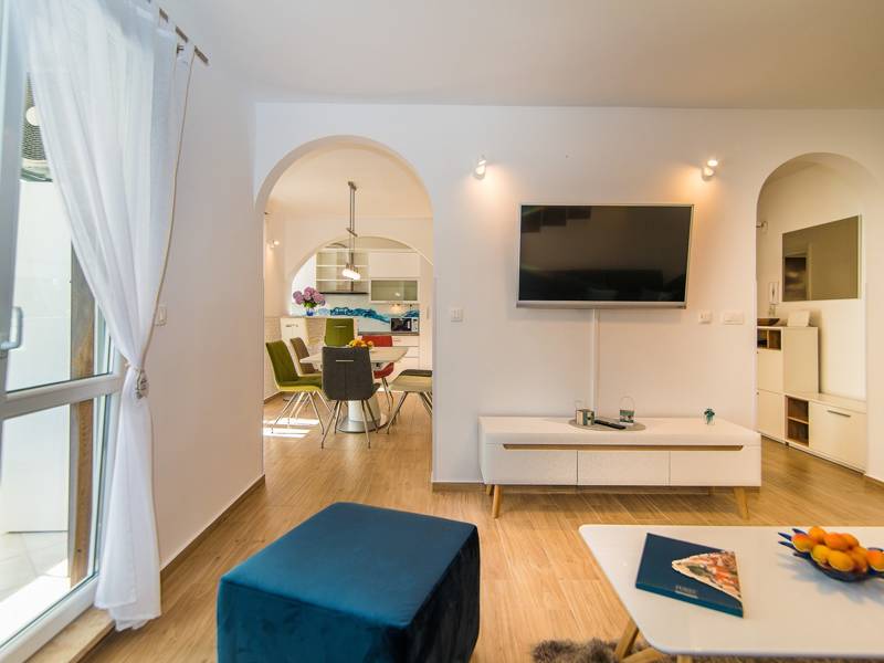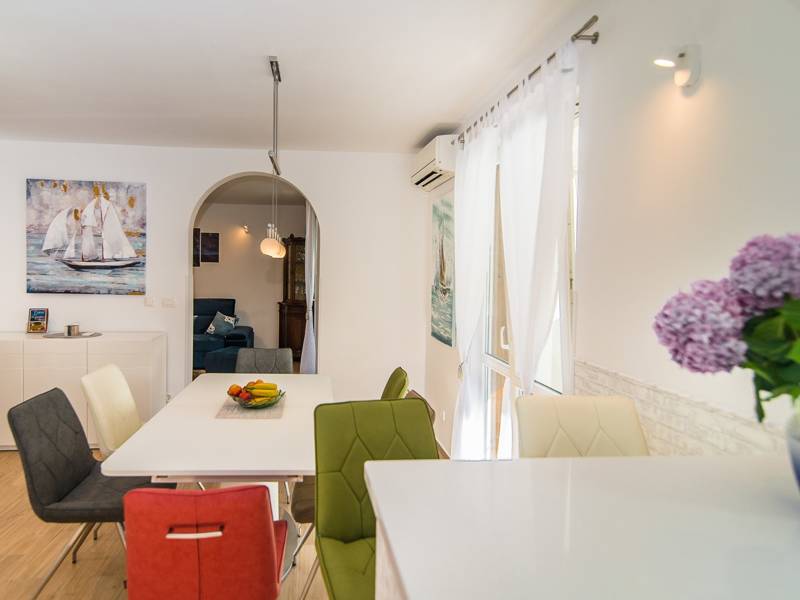 Nicely furnished, comfortable apartment in Poreč with balcony located near the beach in Poreč. This modern and comfortable apartment in the center of Poreč can accommodate up to four persons. The apartment is located on the first floor of the building and has a balcony with seating furniture and a dining table. It consists of two bedrooms with double beds, a bathroom with a shower and a spacious living area with a fully equipped kitchen and an exit to the covered balcony. All rooms are air-conditioned. Included in the rental price are: bed linen, towels, Wi-Fi and parking. The great advantage of this apartment is the vicinity of the beach (150 m) and the city center (200 m). Come to Poreč and spend an unforgettable vacation with your family in this great apartment. Explore all the amazing things Poreč and Istria have to offer and make some wonderful memories with your loved ones.