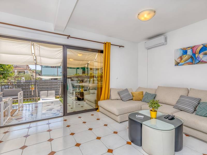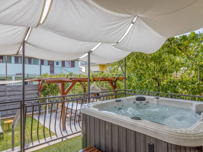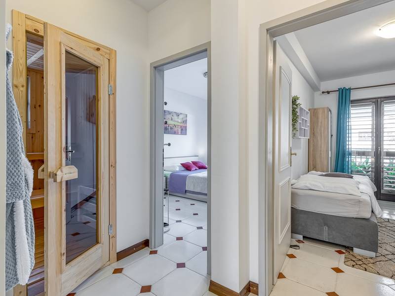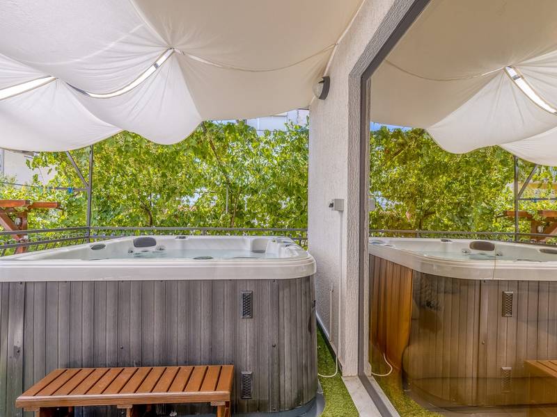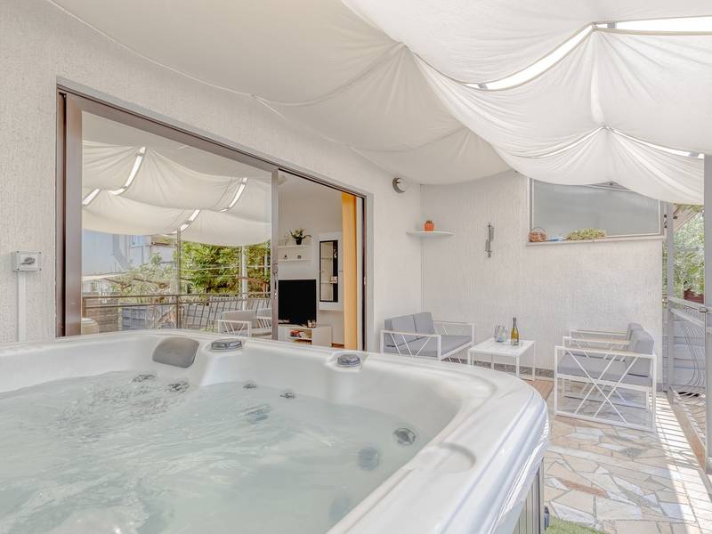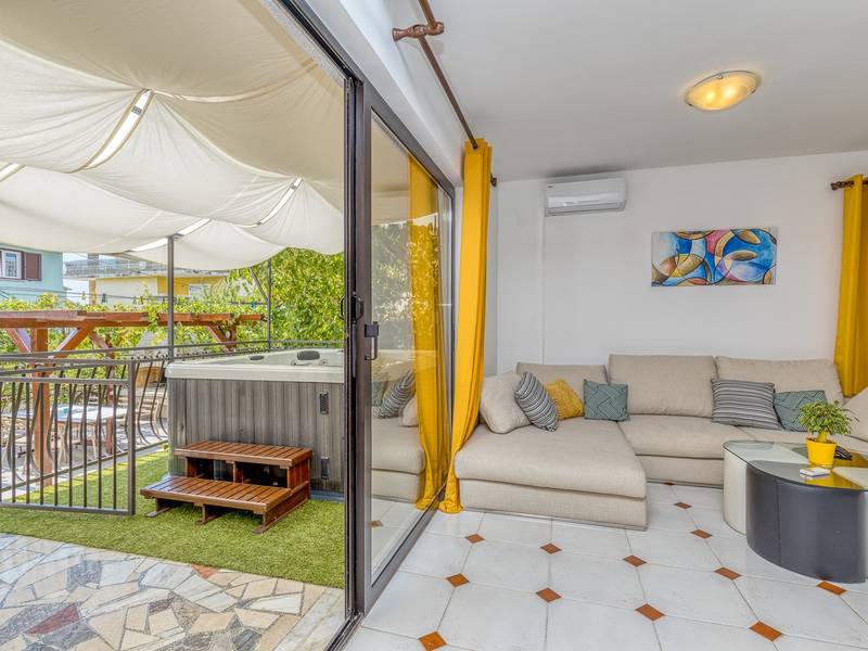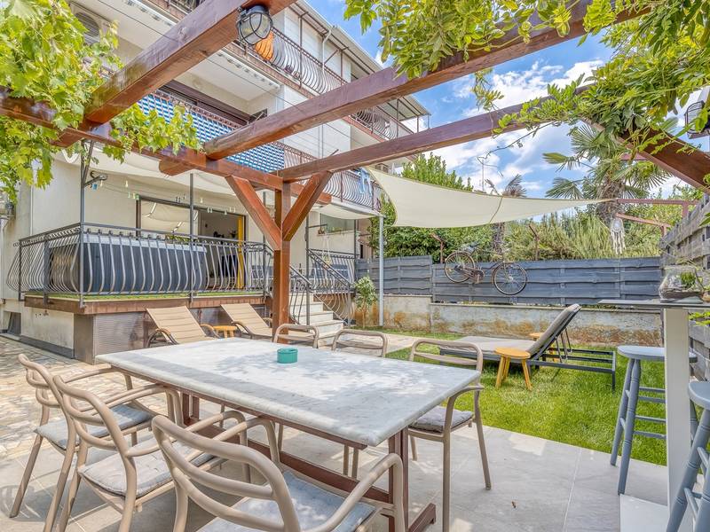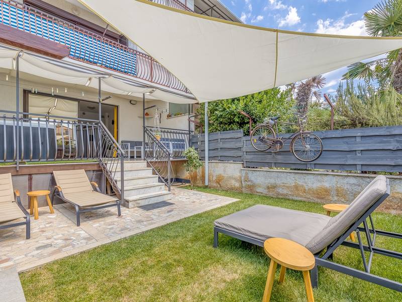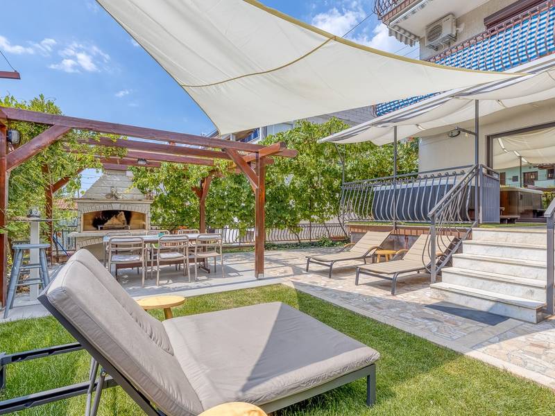This beautifully decorated air-conditioned apartment of 80m2 with a rich content is located in a great location near the city center. It is only 700m from the sea. The apartment consists of two bedrooms, one with a double bed and one with two single beds, a bathroom with a shower, an equipped kitchen and a spacious living room. There is a sauna in the central part of the apartment and a Jacuzzi on the covered terrace, which you can enjoy after swimming in the sea and sunbathing on the beautiful beaches nearby. On warm summer evenings, you can hang out on the terrace while preparing food on the grill. The apartment offers a spacious yard where you can sunbathe on deckchairs or simply relax in socializing. In this location, there are excellent restaurants, wine shops and shopping centers nearby. You can walk to the city center and enjoy the many facilities that this beautiful city offers.