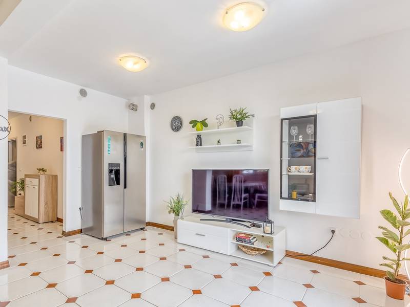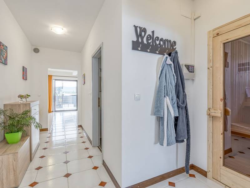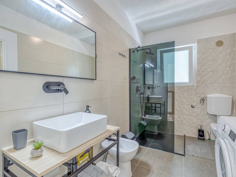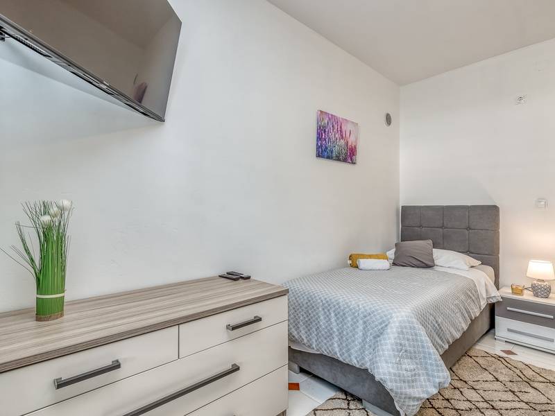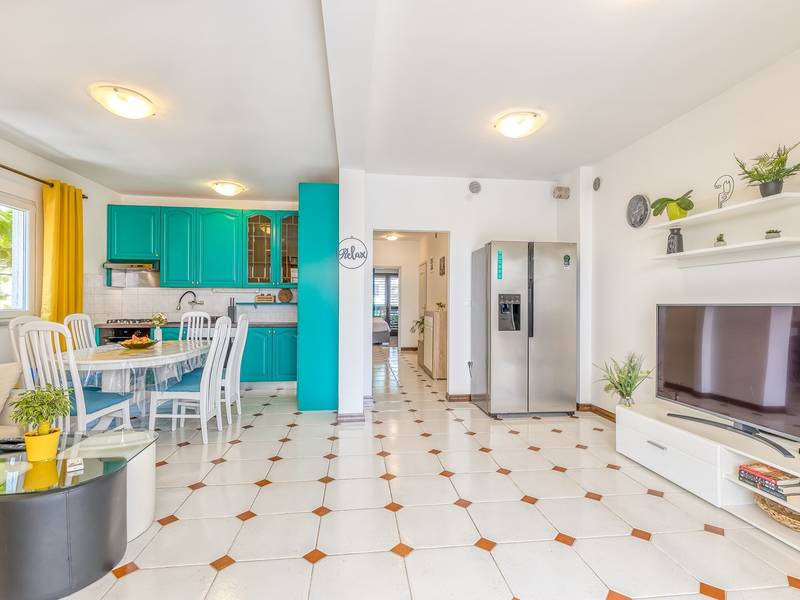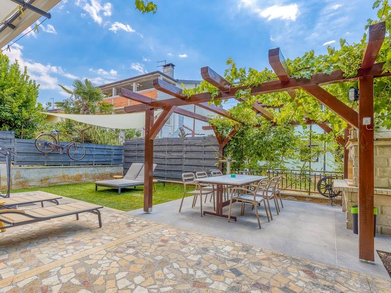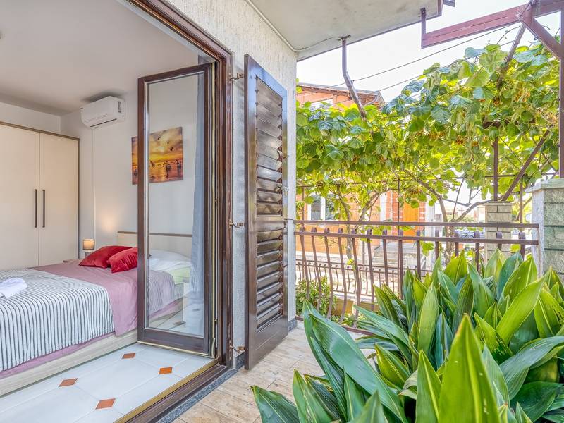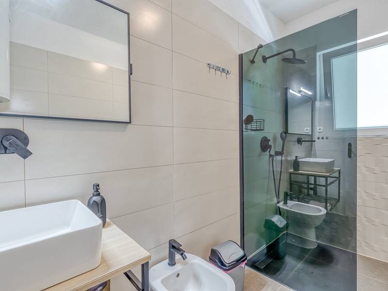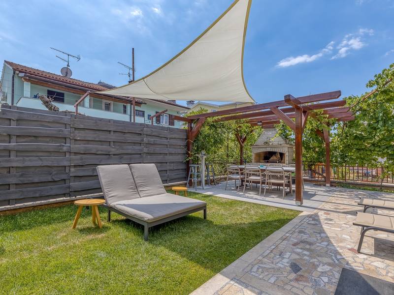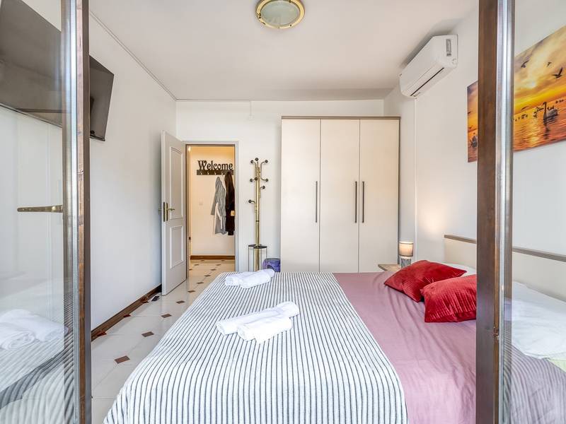 This beautifully decorated air-conditioned apartment of 80m2 with a rich content is located in a great location near the city center. It is only 700m from the sea. The apartment consists of two bedrooms, one with a double bed and one with two single beds, a bathroom with a shower, an equipped kitchen and a spacious living room. There is a sauna in the central part of the apartment and a Jacuzzi on the covered terrace, which you can enjoy after swimming in the sea and sunbathing on the beautiful beaches nearby. On warm summer evenings, you can hang out on the terrace while preparing food on the grill. The apartment offers a spacious yard where you can sunbathe on deckchairs or simply relax in socializing. In this location, there are excellent restaurants, wine shops and shopping centers nearby. You can walk to the city center and enjoy the many facilities that this beautiful city offers.