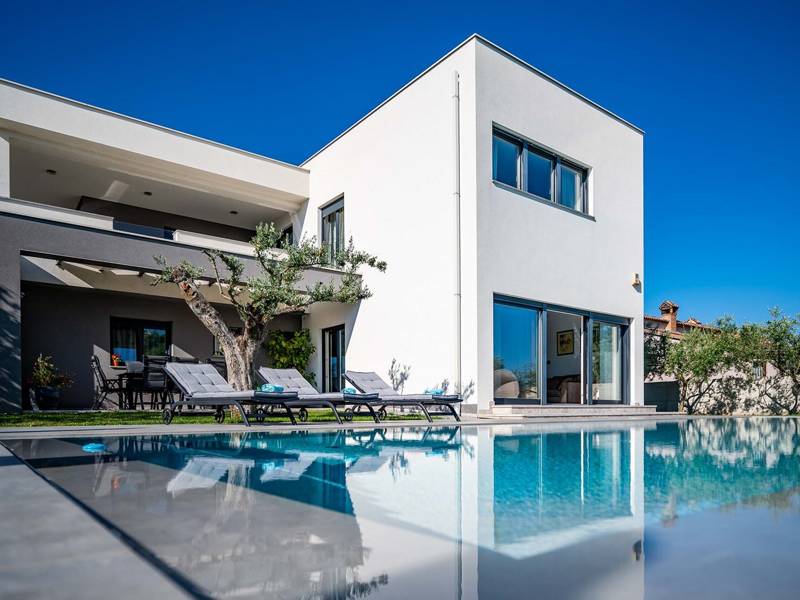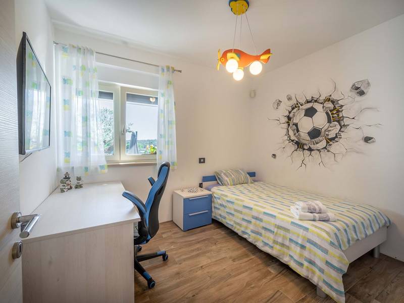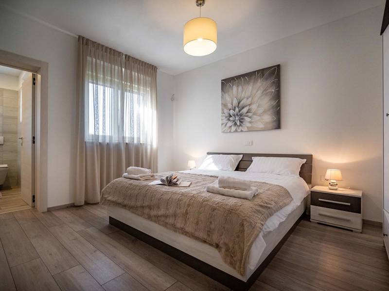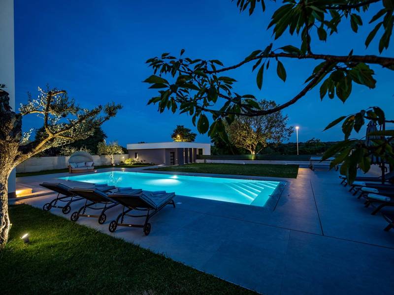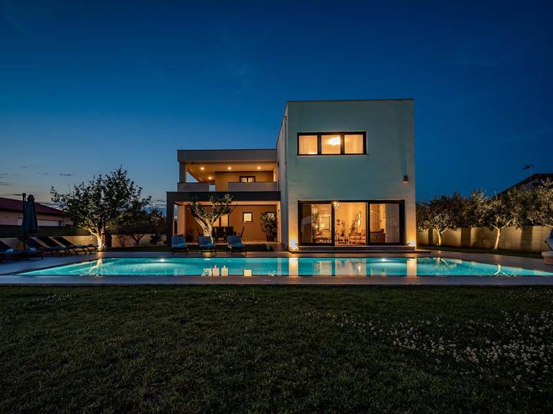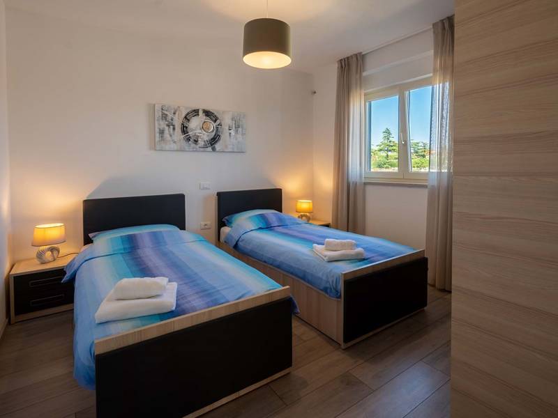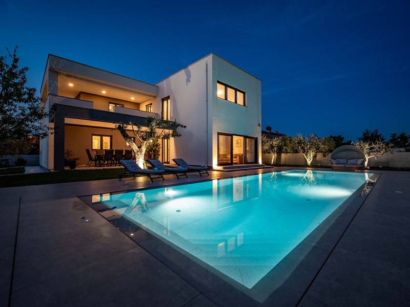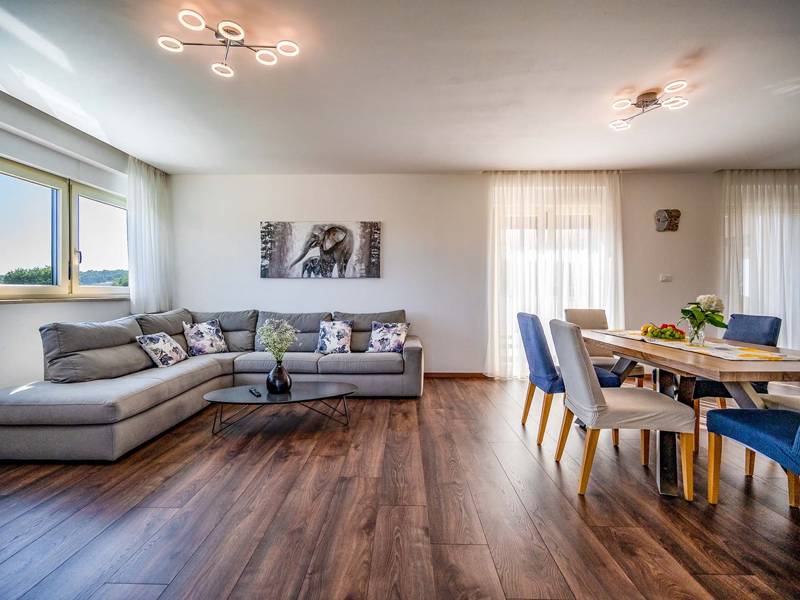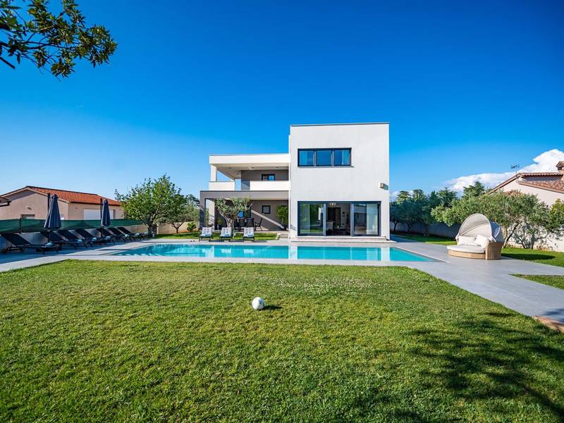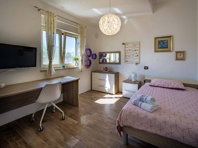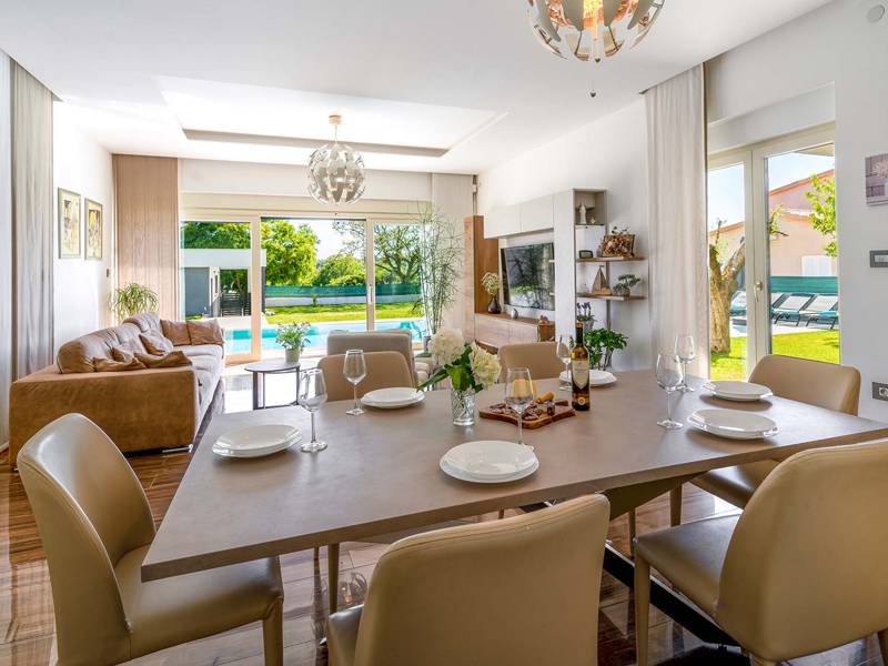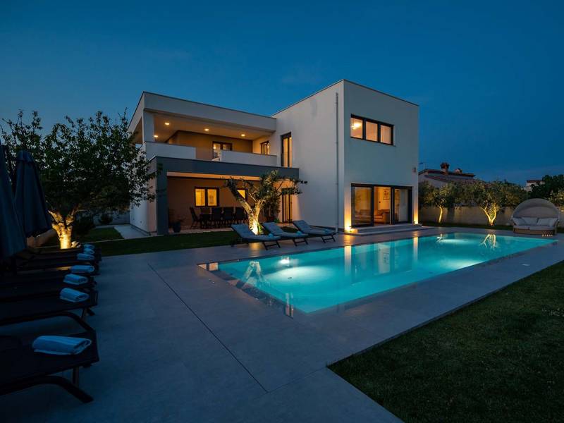 Villa Luen is a modern holiday home located at the entrance to Pula, the largest city on the Istrian peninsula with numerous historical landmarks. The house consists of two apartments, each on its own floor, connected by an internal staircase. This is particularly attractive for two families wishing to enjoy a holiday together while still maintaining their privacy. The house has a total of 6 bedrooms and, thanks to additional beds, can accommodate up to 11 people.The sleeping arrangements include three bedrooms with double beds, one bedroom with two single beds that can be joined into a double bed, and two bedrooms with one single bed each. Additional beds can be placed in any room, adapting to the guests' needs.While the upper floor is somewhat more casually furnished, the lower floor exudes elegance with elements like warm sand colors and refined furniture. Both floors share perfect proportions, spaciousness, and plenty of light. This detached villa with a swimming pool also has comfortable shaded terraces that offer peace and relaxation. It is far enough from the city's hustle and bustle, yet only a few minutes' drive from the city center and the nearest beach.Some of the properties don’t allow youth groups. If you are booking an accommodation facility as a group of young individuals, contact our agency before making the reservation in order to check whether the requested property allows your stay.