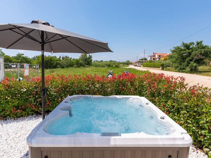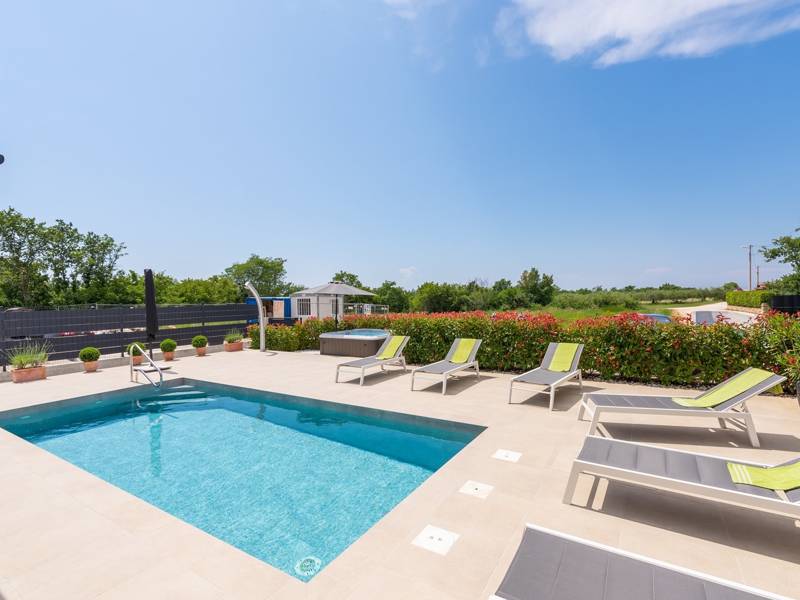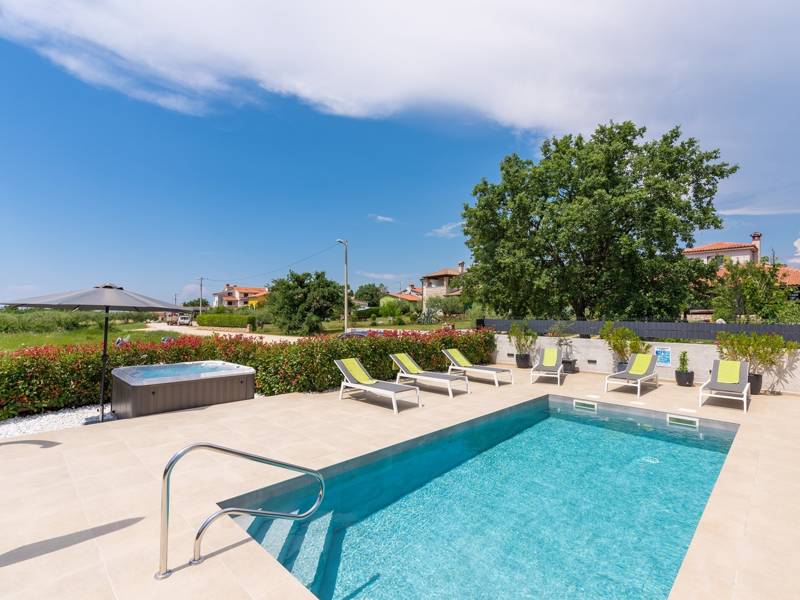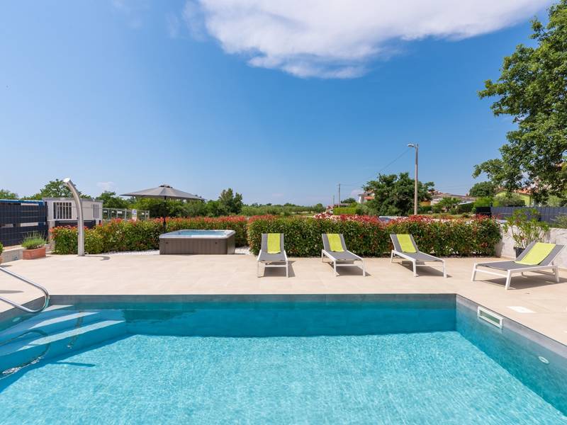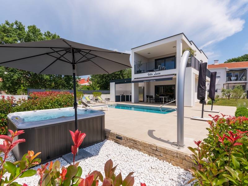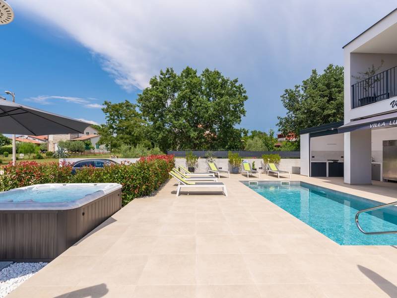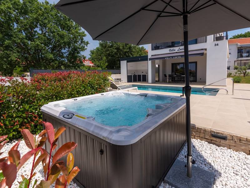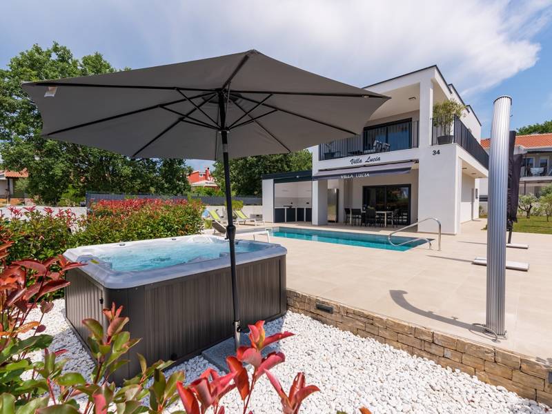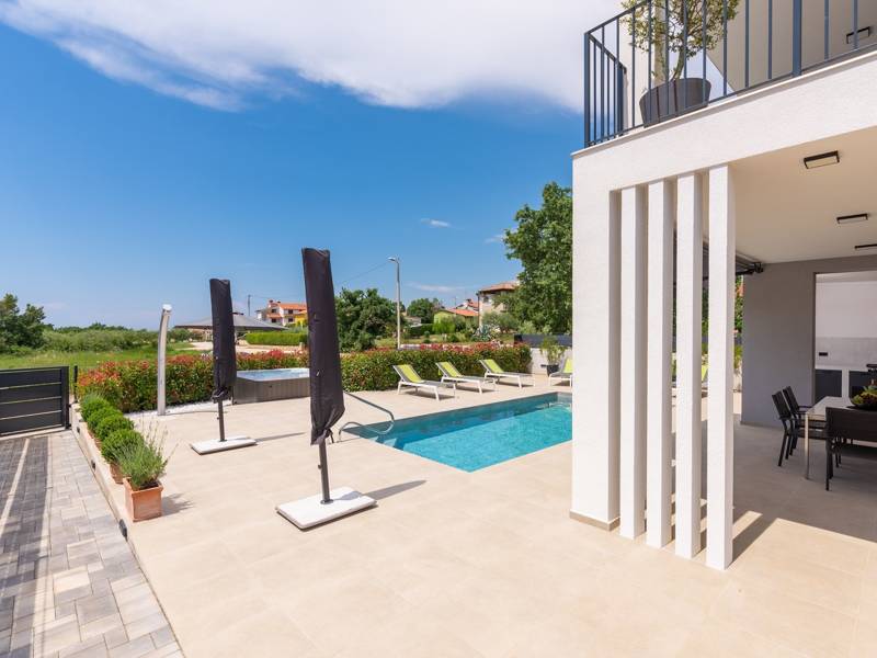 Contemporary Villa Lucia in Radosi is a newly built, modern luxury villa with private pool and Jacuzzi. It is located on a 3000m2 large plot of which 600m2 is arranged and fenced and offers 140m2 of living space. The ground floor has a large living room with corner sofa, fully equipped kitchen and toilet. Upstairs are 3 bedrooms and 2 bathrooms. One room opens onto a large terrace with a seating area from which you can enjoy a beautiful view of the pool and the sea. Two rooms have a shared bathroom and one room has its own bathroom. In the yard there is a swimming pool, jacuzzi, shower. There is a washing machine in a separate room. In the beautifully landscaped courtyard, guests can enjoy a private pool, jacuzzi or socialize with their favorite barbecue dishes. The villa is fully air conditioned, has underfloor heating and offers 2 parking spaces in front of the house. If you are planning a relaxing peaceful vacation in a luxury villa near the sea near Porec - Villa Lucia is the right choice.