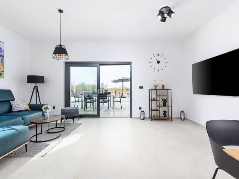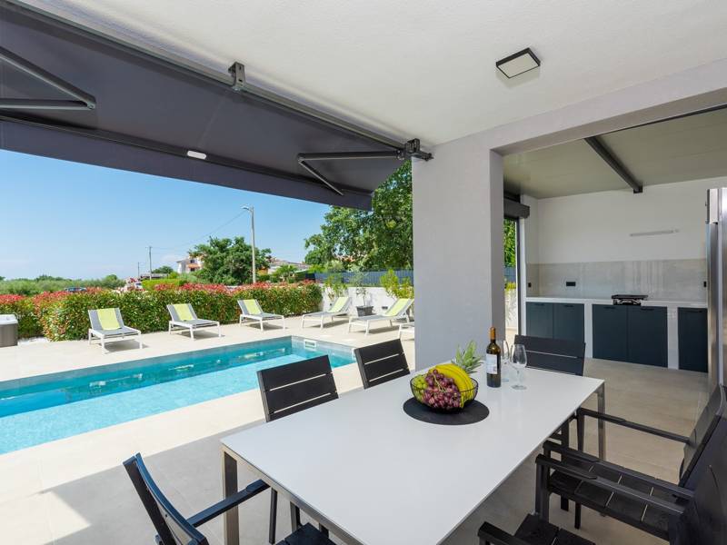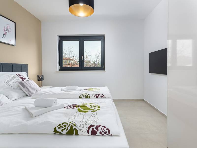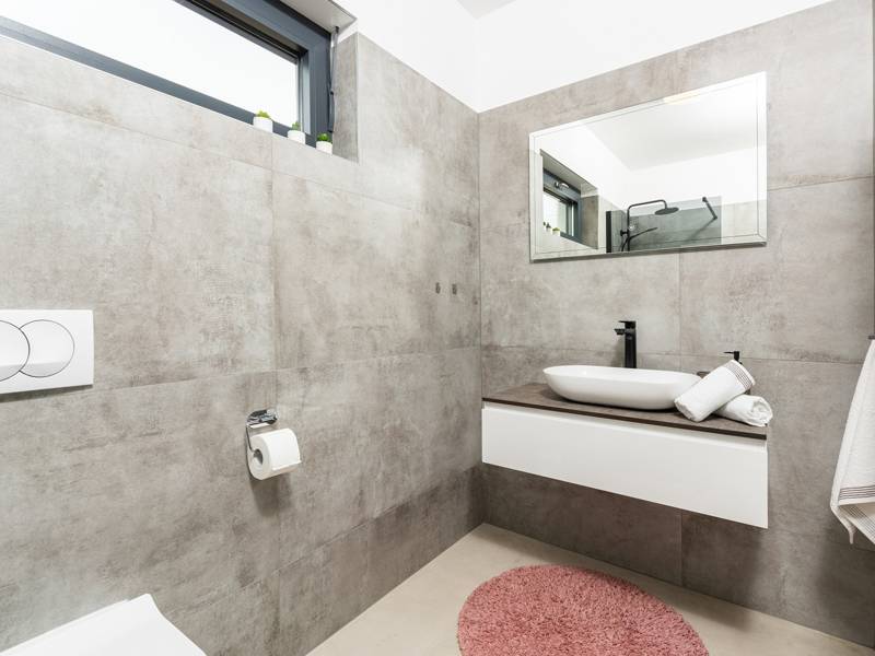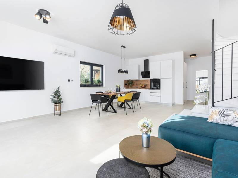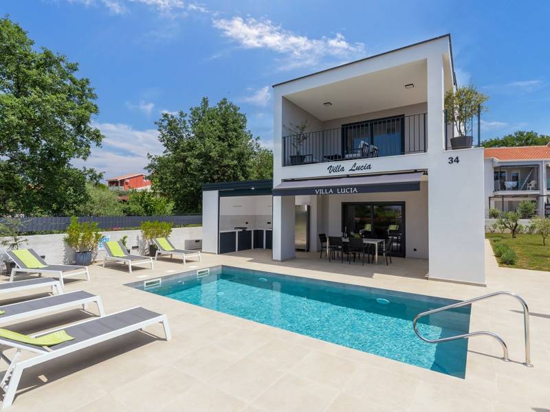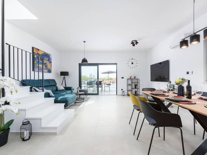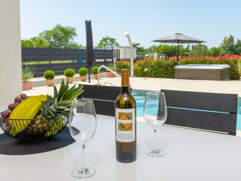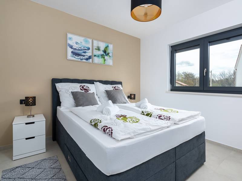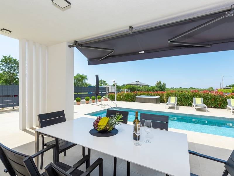 Contemporary Villa Lucia in Radosi is a newly built, modern luxury villa with private pool and Jacuzzi. It is located on a 3000m2 large plot of which 600m2 is arranged and fenced and offers 140m2 of living space. The ground floor has a large living room with corner sofa, fully equipped kitchen and toilet. Upstairs are 3 bedrooms and 2 bathrooms. One room opens onto a large terrace with a seating area from which you can enjoy a beautiful view of the pool and the sea. Two rooms have a shared bathroom and one room has its own bathroom. In the yard there is a swimming pool, jacuzzi, shower. There is a washing machine in a separate room. In the beautifully landscaped courtyard, guests can enjoy a private pool, jacuzzi or socialize with their favorite barbecue dishes. The villa is fully air conditioned, has underfloor heating and offers 2 parking spaces in front of the house. If you are planning a relaxing peaceful vacation in a luxury villa near the sea near Porec - Villa Lucia is the right choice.