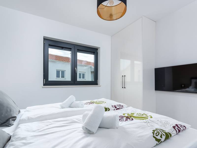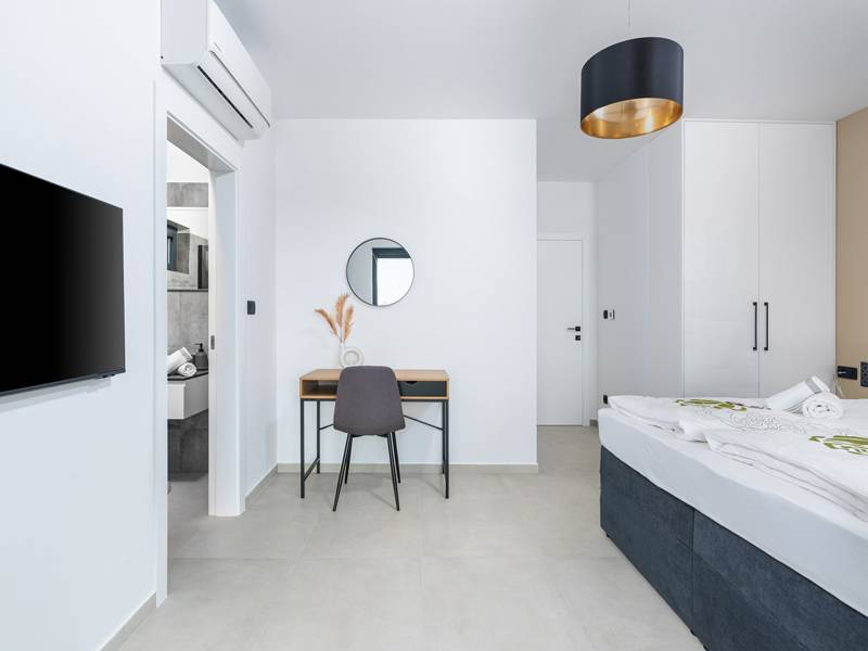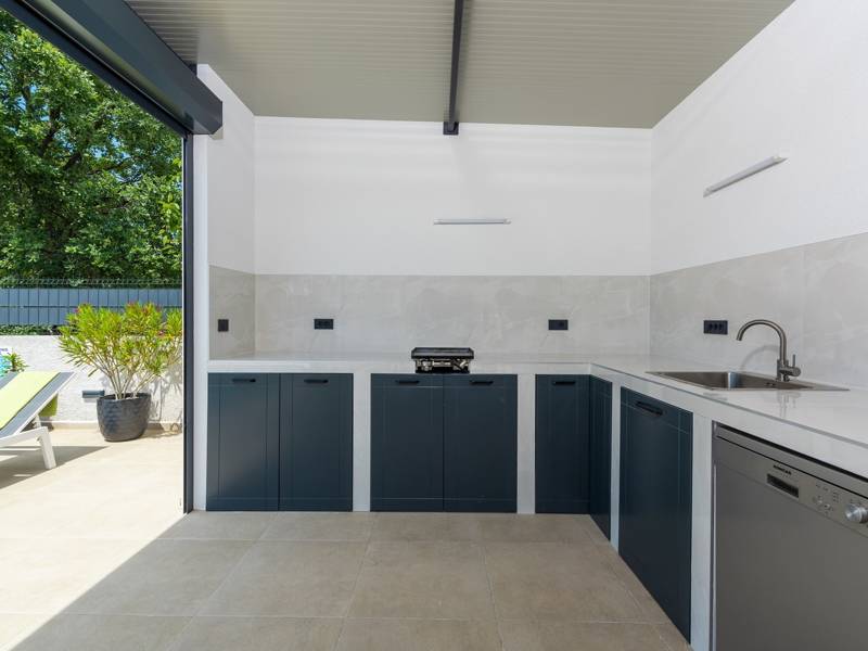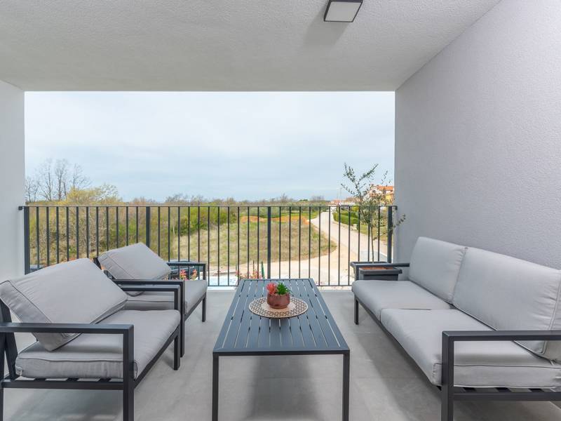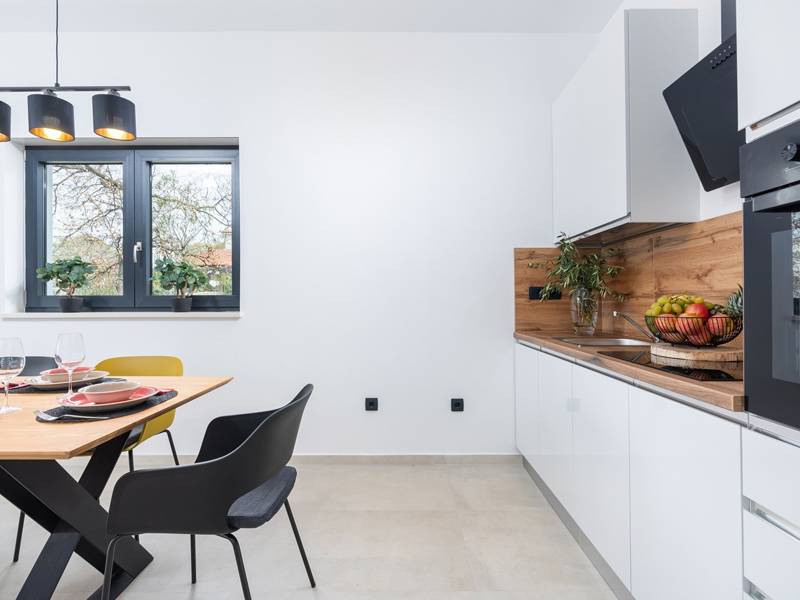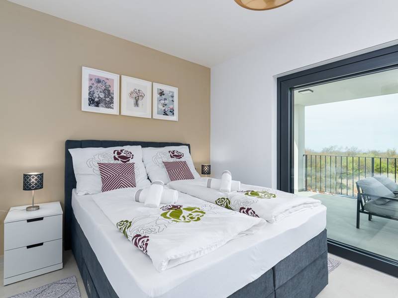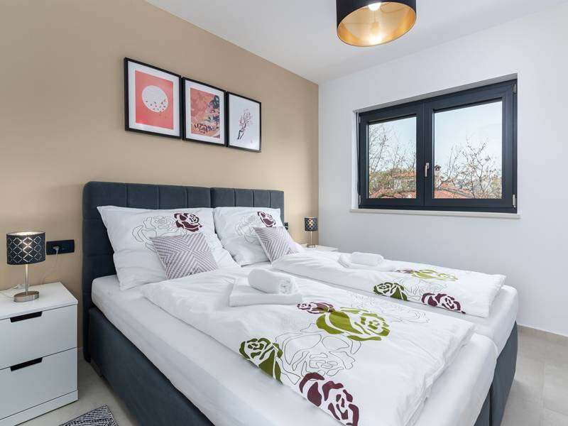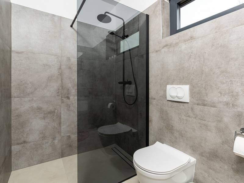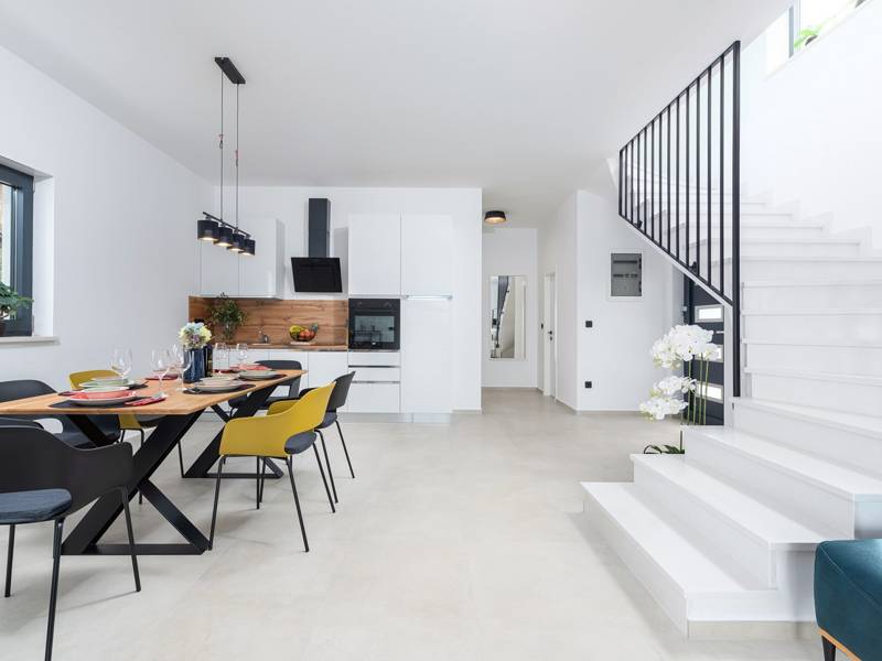 Contemporary Villa Lucia in Radosi is a newly built, modern luxury villa with private pool and Jacuzzi. It is located on a 3000m2 large plot of which 600m2 is arranged and fenced and offers 140m2 of living space. The ground floor has a large living room with corner sofa, fully equipped kitchen and toilet. Upstairs are 3 bedrooms and 2 bathrooms. One room opens onto a large terrace with a seating area from which you can enjoy a beautiful view of the pool and the sea. Two rooms have a shared bathroom and one room has its own bathroom. In the yard there is a swimming pool, jacuzzi, shower. There is a washing machine in a separate room. In the beautifully landscaped courtyard, guests can enjoy a private pool, jacuzzi or socialize with their favorite barbecue dishes. The villa is fully air conditioned, has underfloor heating and offers 2 parking spaces in front of the house. If you are planning a relaxing peaceful vacation in a luxury villa near the sea near Porec - Villa Lucia is the right choice.