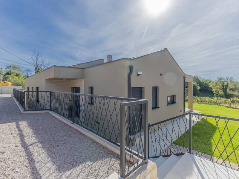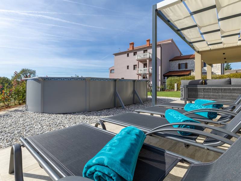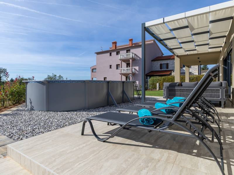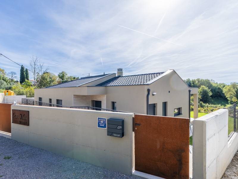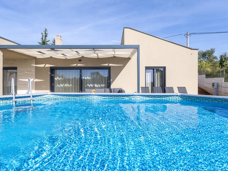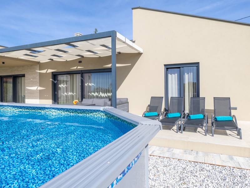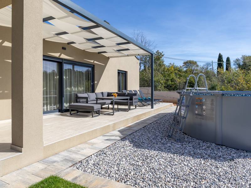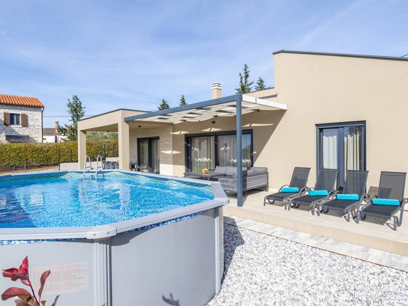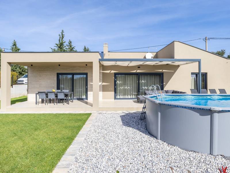 Located in the quiet village of Rebići, just 1.5 km from the picturesque Blaz Bay, this newly built single-storey holiday home is the perfect choice for a family holiday in Istria. The house offers three comfortable bedrooms, two modern bathrooms, a spacious living room with a fully equipped kitchen and a private garden with a prefabricated swimming pool — ideal for summer refreshment and children's play. Guests also have private parking available within the garden. Surrounded by greenery and silence, this house offers peace, comfort and relaxation, while Blaz Bay offers clear sea and untouched nature. This is an ideal destination for guests looking for peace, privacy, and a natural environment away from the city crowds. We recommend it to families, younger groups of people are not allowed. The pool is not in use from October 15th to April 30th.