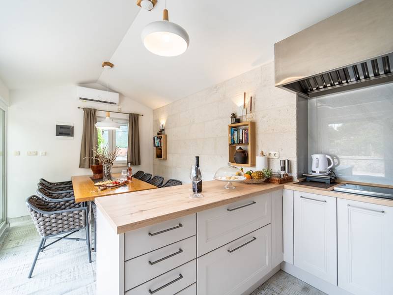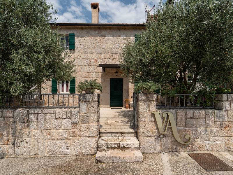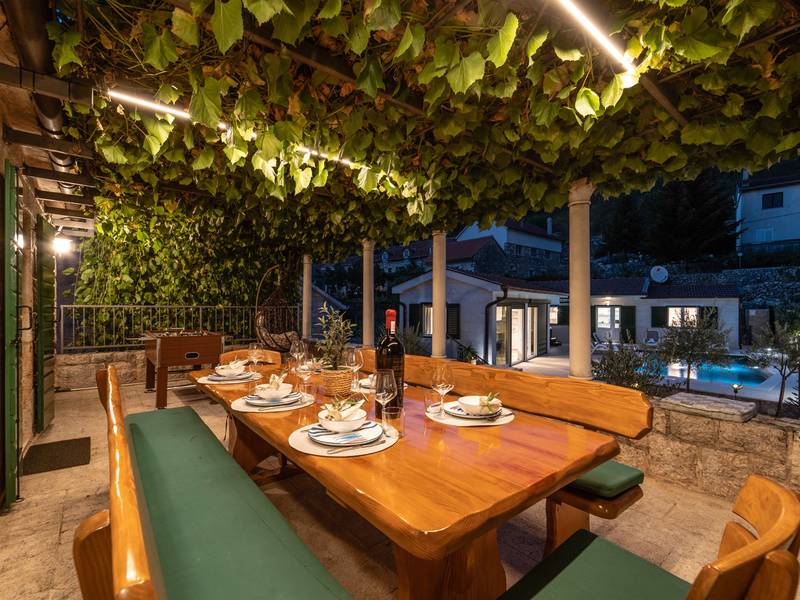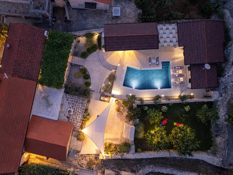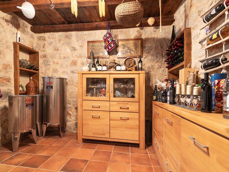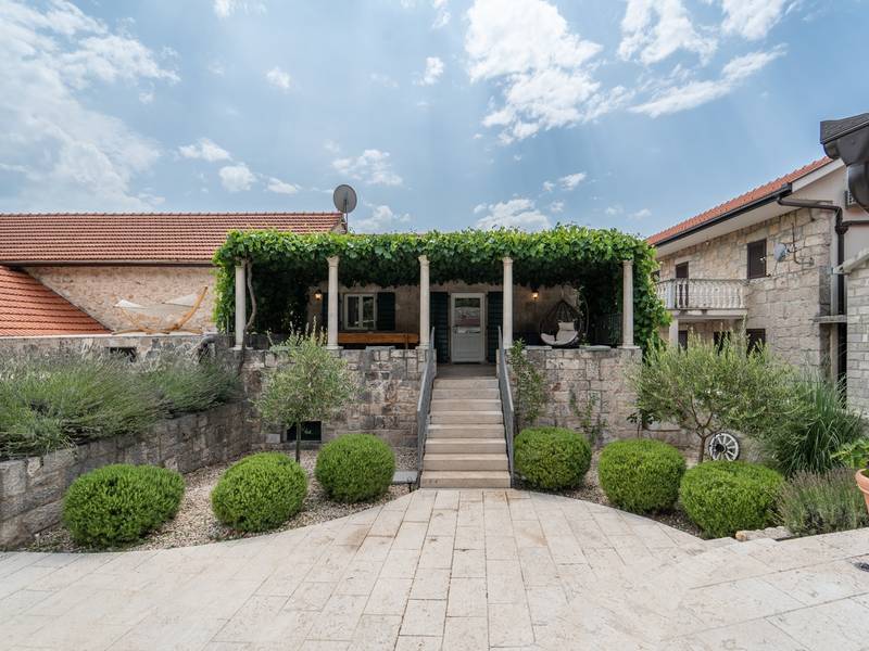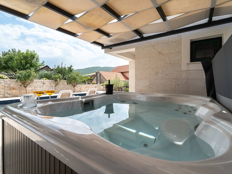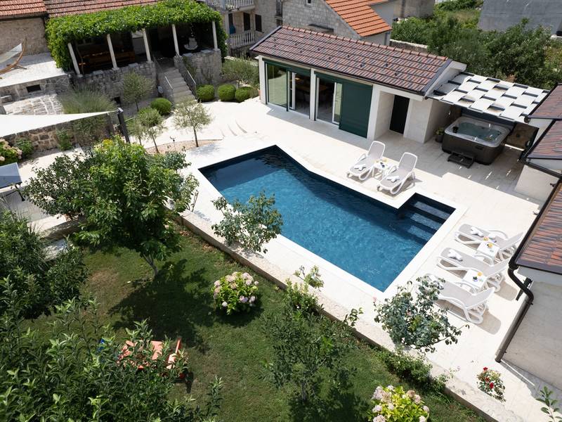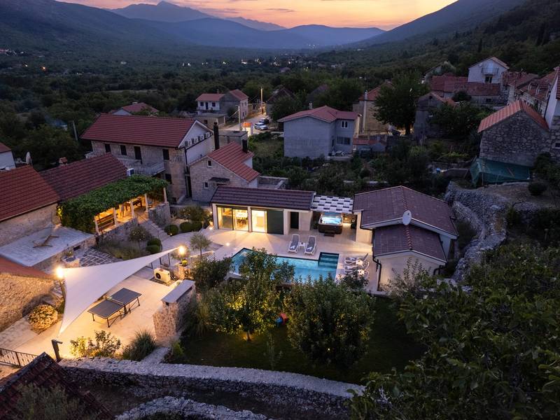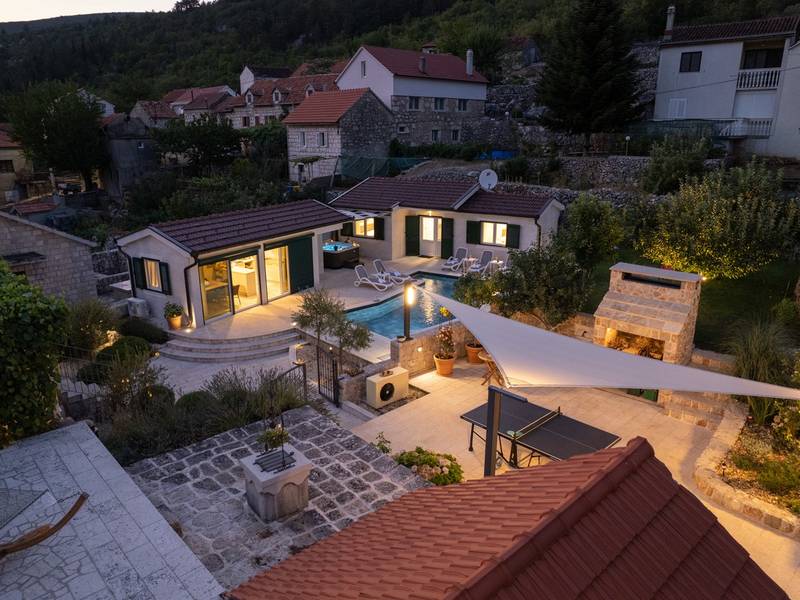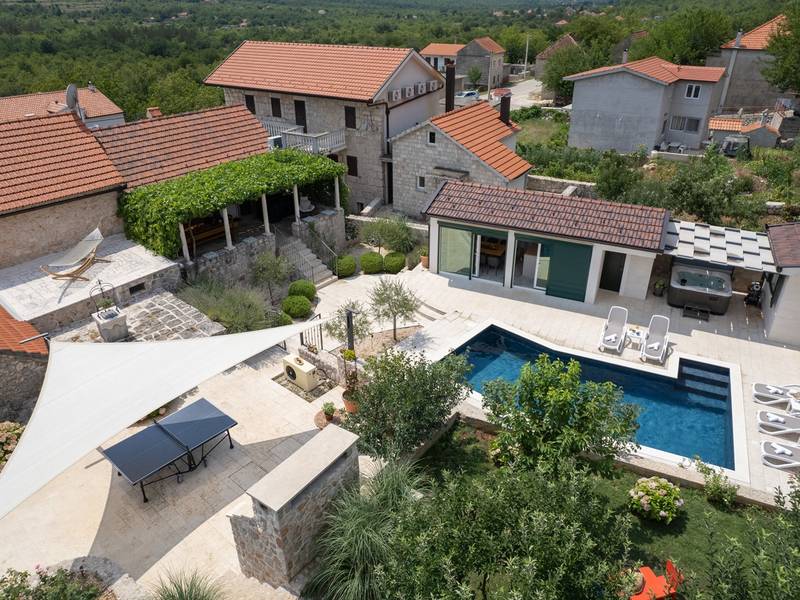 Nestled in the charming village of Slivno, Imotski, Villa Aurora offers a perfect getaway in the heart of Dalmatia. This beautifully renovated traditional stone villa, built in 1911, features a private heated 28 sqm pool with hydromassage, a Turkish sauna, and a Hot tub for ultimate relaxation. Stylishly designed and fully equipped for the modern guest, this villa warmly welcomes your four-legged family members, too! With 5 bedrooms organised in two connected units, it’s ideal for families and groups. Just 13 km from Imotski, 20 km from Makarska, 44 km from Omiš, and 65 km from Split, the region’s capital.- Two Gorgeous Houses offered exclusively for you:- Main stone House: - On the Air-conditioned ground floor, you’ll find a fully equipped modern kitchen, a dining area, and a cosy living room with a TV and a fireplace, alongside a Family bathroom with a shower and washing machine and a Turkish sauna for ultimate relaxation. - A charming ˝tavern˝ style room is also located on this level, traditionally decorated and stocked with premium local wines for your enjoyment. - The first floor features Bedroom No1 (11sqm) with a double bed, Bedroom No2 (8sqm) with a double bed and single bunk bed (perfect for kids), Bedroom No3 (6sqm) with a single bed. From the stone house, you have a lovely naturally shaded outdoor terrace with a wooden dining table, a table soccer and a swinging egg chair overlooking the pool area— perfect for savouring those warm summer evenings. - Pool Cottage: - This new part of the house offers an air-conditioned living/dining area and a fully equipped kitchen with direct access to the pool. There are Bedrooms No. 4 and No. 5, both with double beds, one family bathroom with a shower and a washing machine. - A covered area with a Hot-Tub (Whirlpool) - There is also an air-conditioned and fully equipped Summer kitchen with a dining table for 10 people with sliding glass doors toward the pool, and there is a separate toilet. A spacious, grassy garden connects the properties, providing a great spot for afternoon coffee or playtime with your pet. Enjoy fresh fruit from the garden or fire up the traditional stone grill for a delicious barbecue, and have fun on an outdoor table tennis table. The outdoor terraces are ideal for socialising and entertaining. Adjacent to it, the stunning outdoor pool awaits, complete with a jacuzzi for ultimate relaxation.Relaxation and EntertainmentVilla Aurora doubles as a spa oasis, featuring:- A Turkish sauna- A heated outdoor pool- A rejuvenating jacuzzi