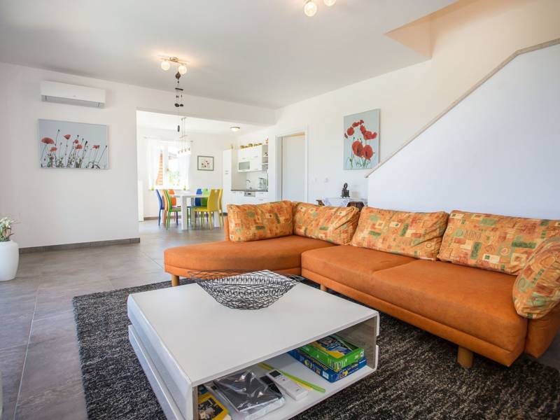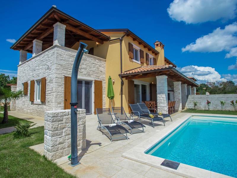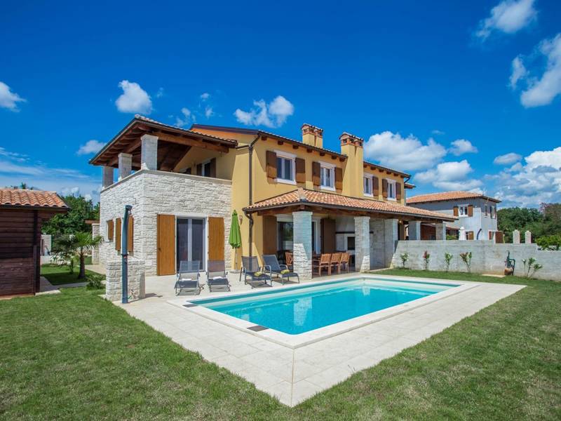 Welcome to Villa Rosalia, a beautiful villa with a swimming pool and sauna, located on the edge of the village Susnjici, 10,5 km from Porec, the beaches, and a wide range of sports and entertainment activities.The holiday home was built in 2017 as a semi-detached house. The other half of the house is also intended for renting. Inside the maintained and fully enclosed garden is a private swimming pool (heated with solar heating) of 24 sqm, sauna, sun chairs, parasol, covered terrace with fireplace and dining table, and parking for two cars.Villa Rosalia can comfortably accommodate 8 persons in a total of 134 sqm on two floors. On the ground floor, there is an air-conditioned living room with a sleeping sofa for two persons and an exit to the terrace, a fully equipped kitchen, and a dining table for 6 persons. There is also an air-conditioned room with a double bed and shower/toilet. A separate toilet is also on the ground floor. The ground floor is suitable for persons with reduced mobility. On the first floor are two air-conditioned rooms with double beds, each with its shower/toilet and exit to the common balcony with sitting furniture.Youth groups are not allowed.Max two pets allowed.