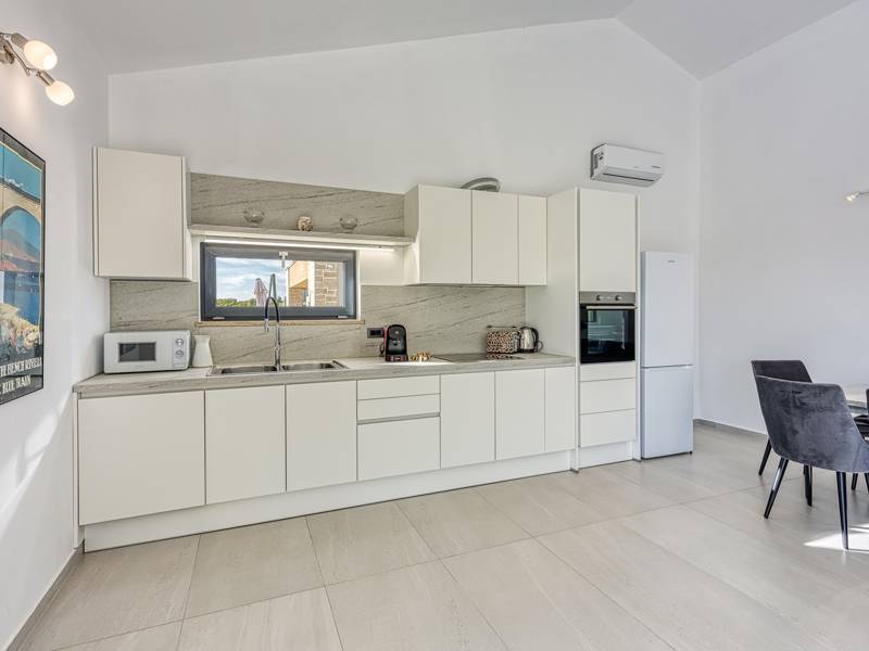 This newly built house is located in Perini, 15 km away from Porec and only 3 kilometres from the historic town of Sveti Lovreč. The house is modernly decorated, and it can accommodate up to 4 people. It consists of a fully equipped kitchen, a living room, two bedrooms, and two bathrooms with a shower. Both bedrooms are air-conditioned, equipped with a comfortable double bed and a Satellite TV. The outdoor area of the house features a private pool, ideal for a refreshing swim on sunny days, along with a jacuzzi and outdoor shower located on the terrace. There are also deckchairs in the yard as well as a spacious terrace with a large dining table. Private parking is available in the yard. Villa "Perini" is an ideal destination for families and friends who want to relax and enjoy the beauty of Istria!