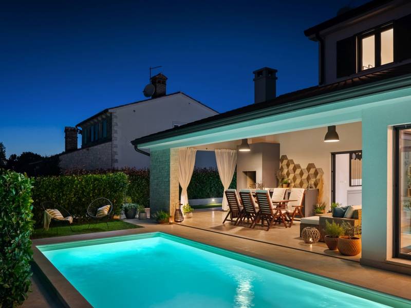 Locatred in the picturesque village of Sv. Lovreč, just 15 km from the vibrant town of Poreč, Villa Laurentii offers a perfect retreat for those seeking both relaxation and convenience. The village boasts essential amenities including a shop, ATM, post office, and café, and a restaurant.This exquisite villa harmoniously combines modern and traditional architecture, featuring expansive glass windows that provide views of the private swimming pool. Situated on a fully enclosed property, guests can enjoy a variety of outdoor amenities including a large covered terrace with a summer kitchen, a fireplace, a comfortable seating area, sun loungers, an outdoor shower, and two parking spaces.Villa Laurentii comfortably accommodates six guests across two fully air-conditioned floors. The ground floor includes a spacious living room with a cozy sitting set, satellite TV, and a fireplace, along with a dining area and a fully equipped kitchen. This floor also features a double bedroom and a shower/toilet. Upstairs, guests will find two additional bedrooms and a well-appointed bathroom, ensuring a comfortable and enjoyable stay for all.Whether lounging by the pool, dining al fresco on the terrace, or exploring the charming surroundings of Sv. Lovreč, Villa Laurentii promises an unforgettable holiday experience.