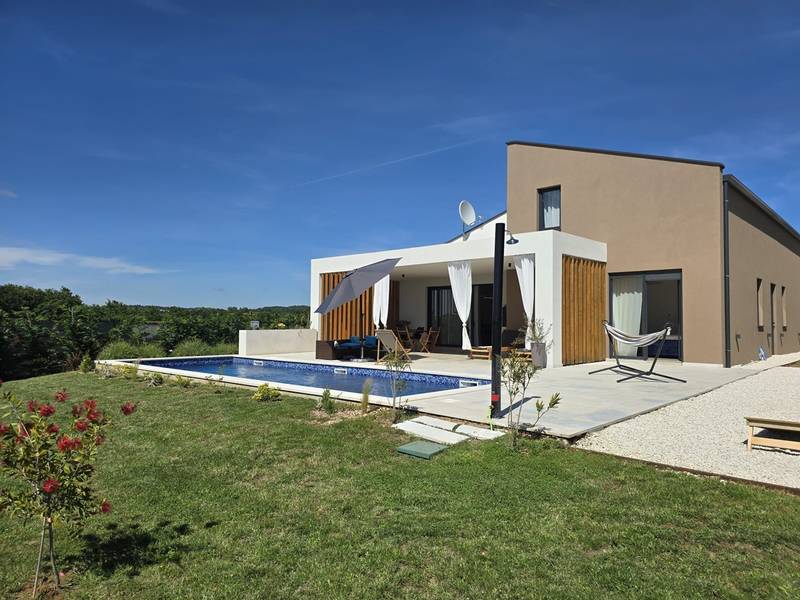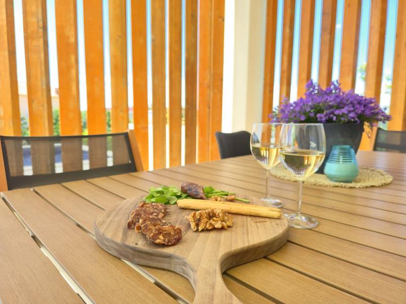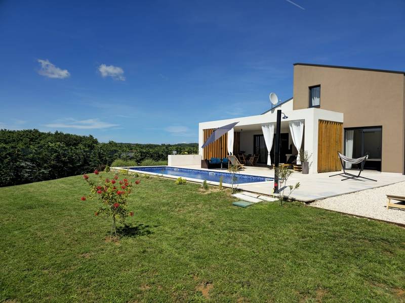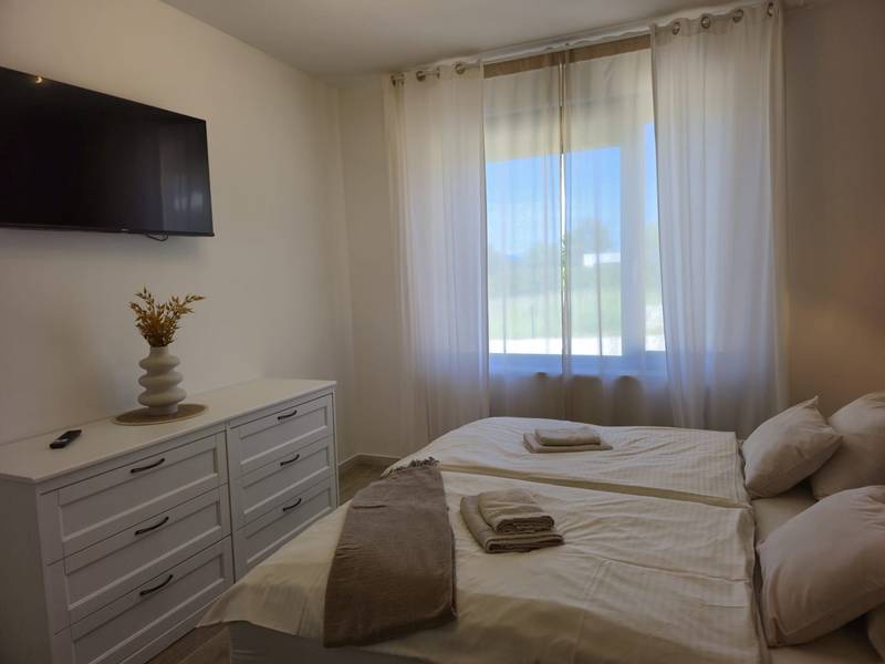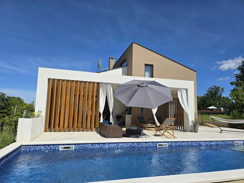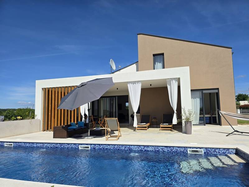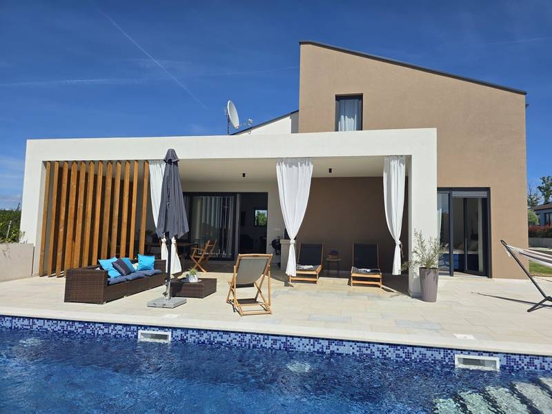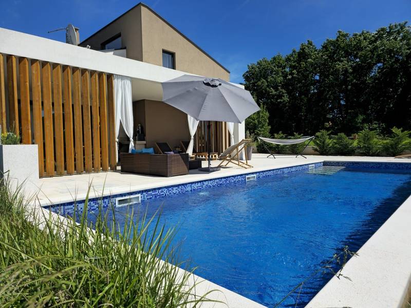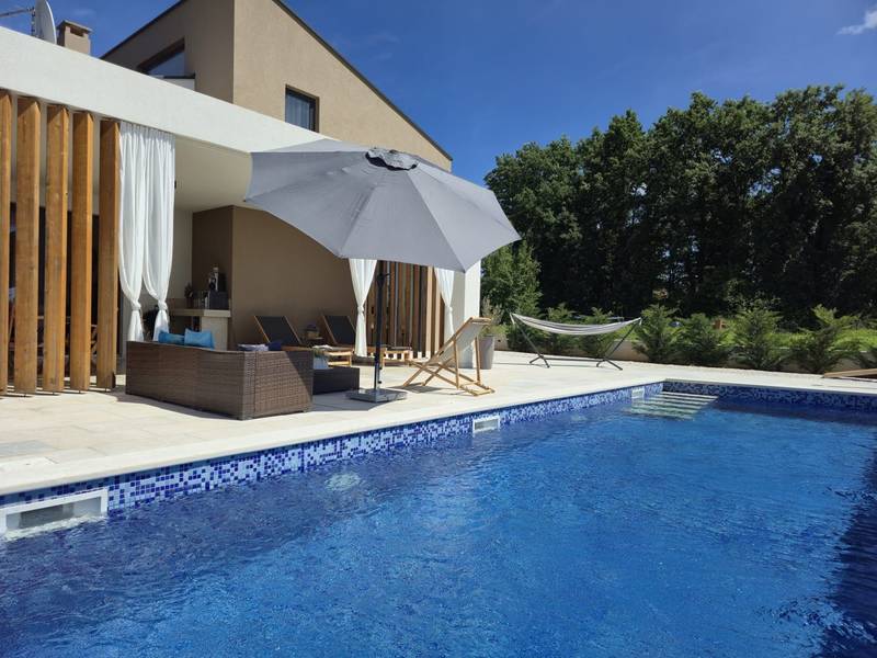 Villa Arija is a modern holiday home designed for guests who appreciate comfort, privacy, and a high standard of accommodation. Situated on a spacious 987 m2 plot, the villa offers 207 m2 of thoughtfully arranged living space and can accommodate up to 8 guests.The property features a private 35 m2 swimming pool, three fully equipped bedrooms with en-suite bathrooms, and a fourth room designed as a game room (PlayStation, TV, darts, foosball, stationary bike) with two additional beds, providing both extra sleeping space and entertainment. This multifunctional room makes the villa particularly suitable for families, kids, or groups seeking both relaxation and leisure activities.The ground floor consists of a bright open-plan living area with comfortable seating, a fully equipped kitchen, and a spacious dining area. Two bedrooms with king-size beds and en-suite bathrooms are also located on this level, along with a guest toilet and a laundry area.On the upper floor, there is one additional bedroom with a private bathroom, as well as the game room with two extra beds. All bedrooms are equipped with air conditioning and TVs.The outdoor area is one of the highlights of Villa Arija. The garden features a private swimming pool with sun loungers, while the covered dining area with a charcoal barbecue is ideal for relaxed meals and gatherings.The villa offers private parking for up to four vehicles and is conveniently located on the edge of a village, within walking distance of a grocery store, bar, and restaurant.Villa Arija is an excellent choice for families or groups looking for a private, well-equipped property with quality outdoor space and additional entertainment options.Max 2 pets are welcome free of charge.