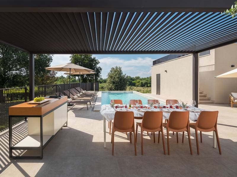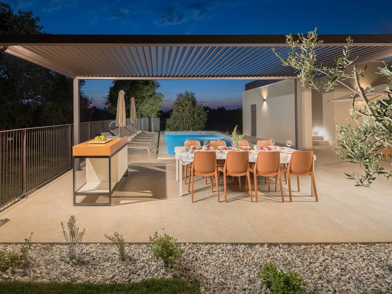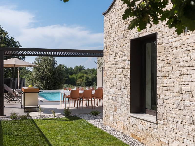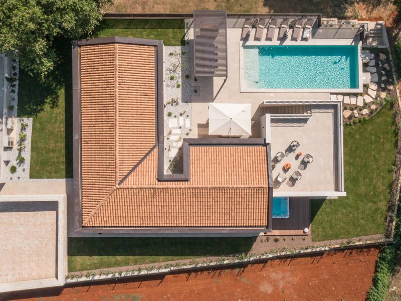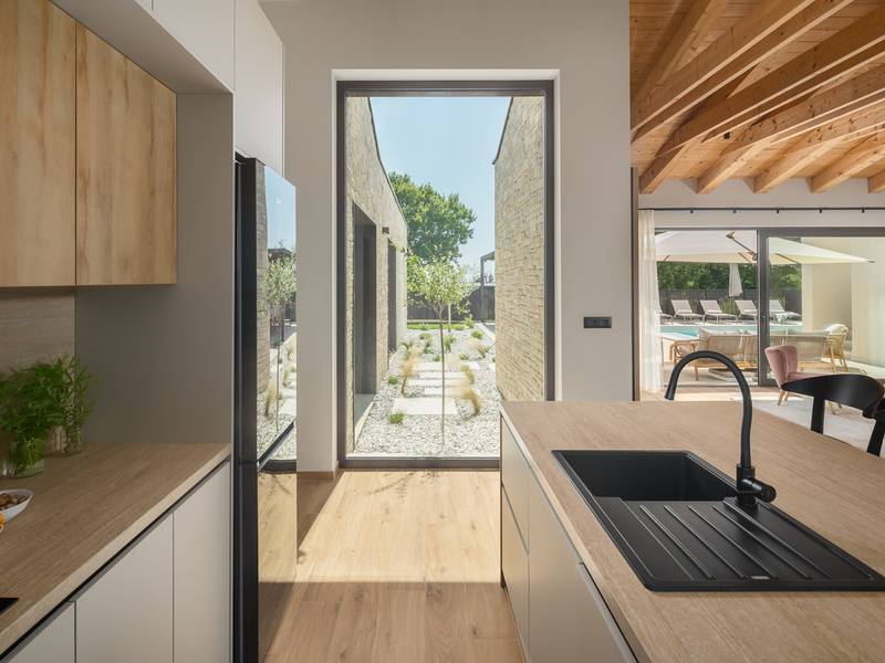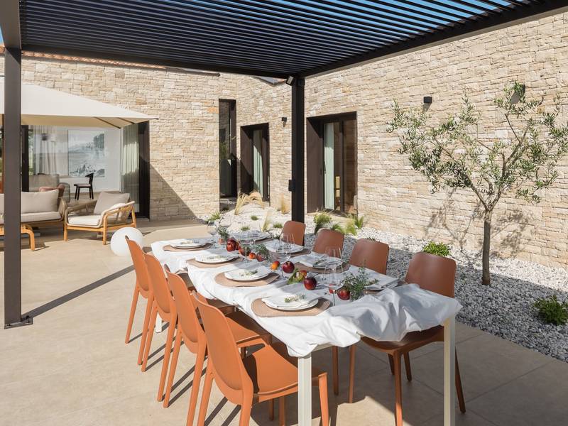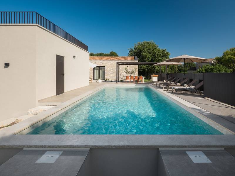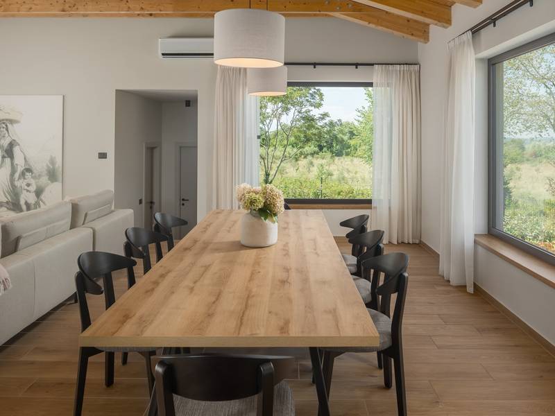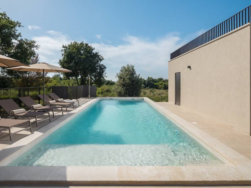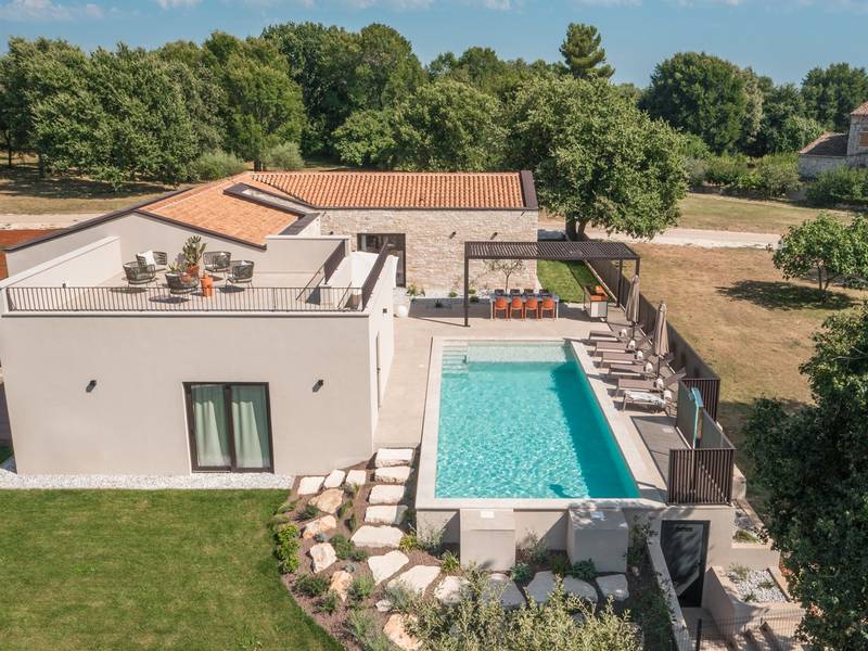 Luxury Villa Casa Maria, located in the peaceful village of Stancija Blek near Tar–Vabriga, Istria, combines historic charm with modern luxury. Surrounded by lush greenery and a spacious private garden, the villa accommodates up to 8 guests in four elegantly furnished double bedrooms, each with its own en-suite bathroom. The open-plan living area features large glass windows overlooking a 50 m2 private pool, seamlessly connecting indoor and outdoor spaces. Guests can relax in the jacuzzi, enjoy the outdoor shower, or unwind in the spa area with an emotional shower. A roof terrace offers stunning sea views, while private parking ensures convenience. The nearest beach is just a few minutes away, and local restaurants, cycling trails, and coastal promenades are easily accessible, making Villa Casa Maria an ideal destination for a luxurious and relaxing Istrian escape.