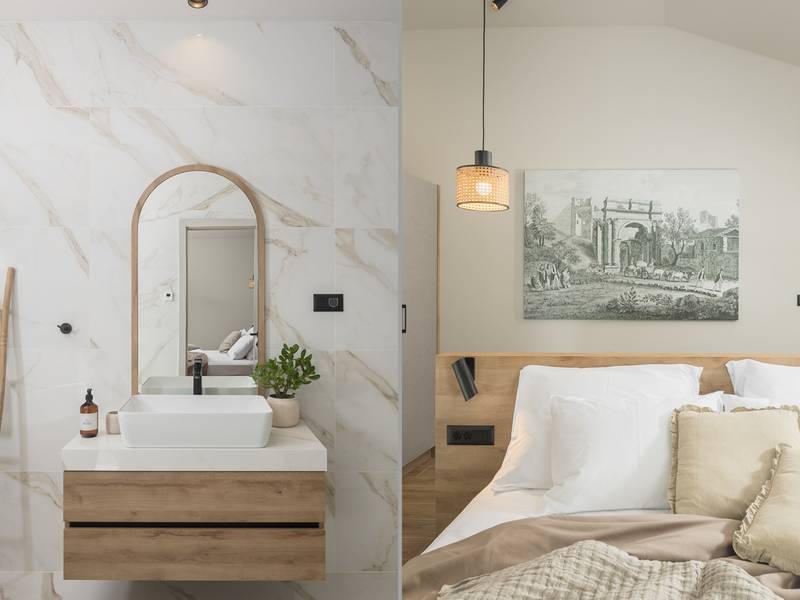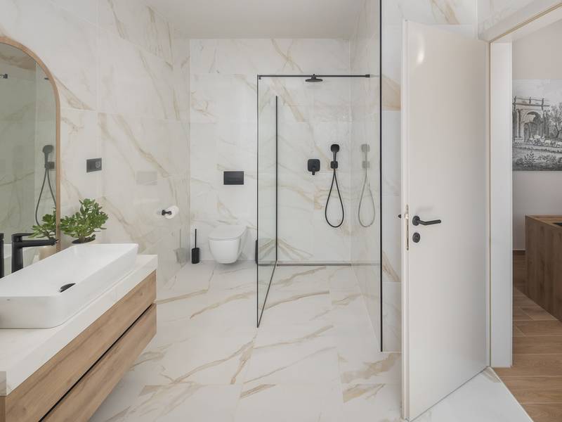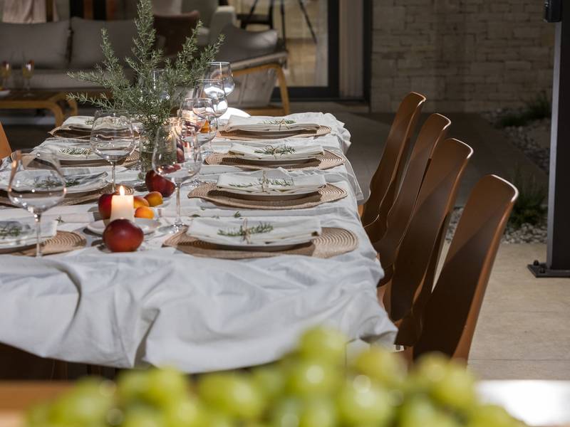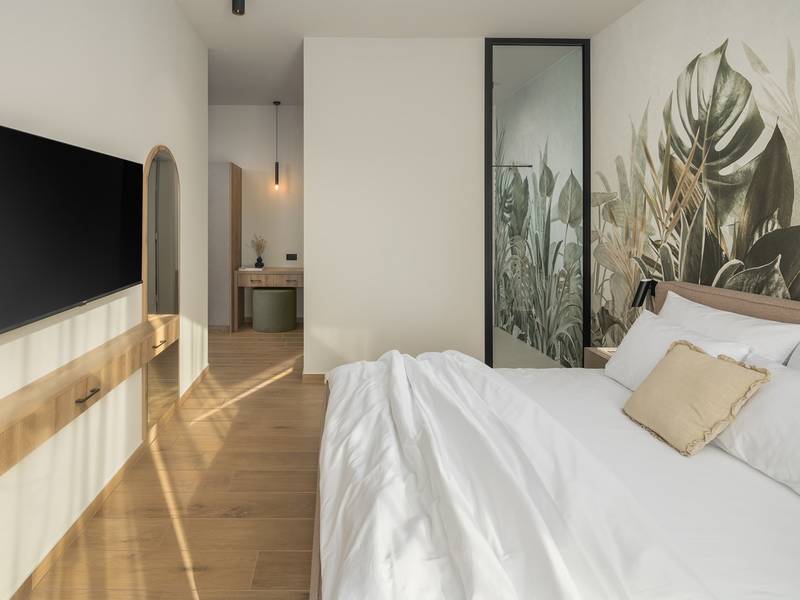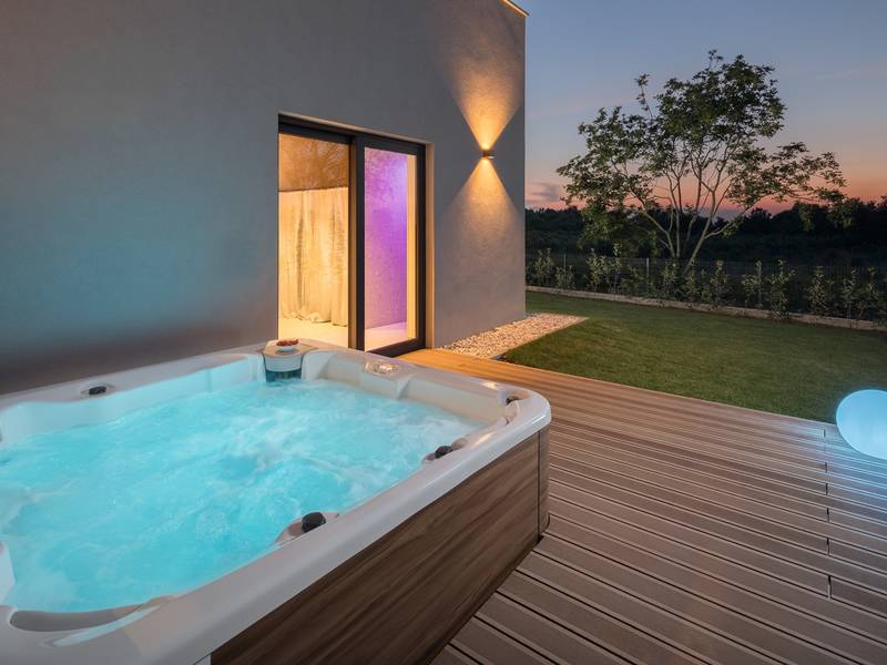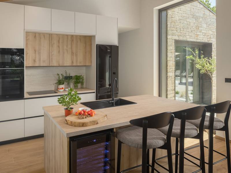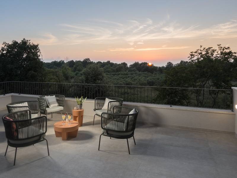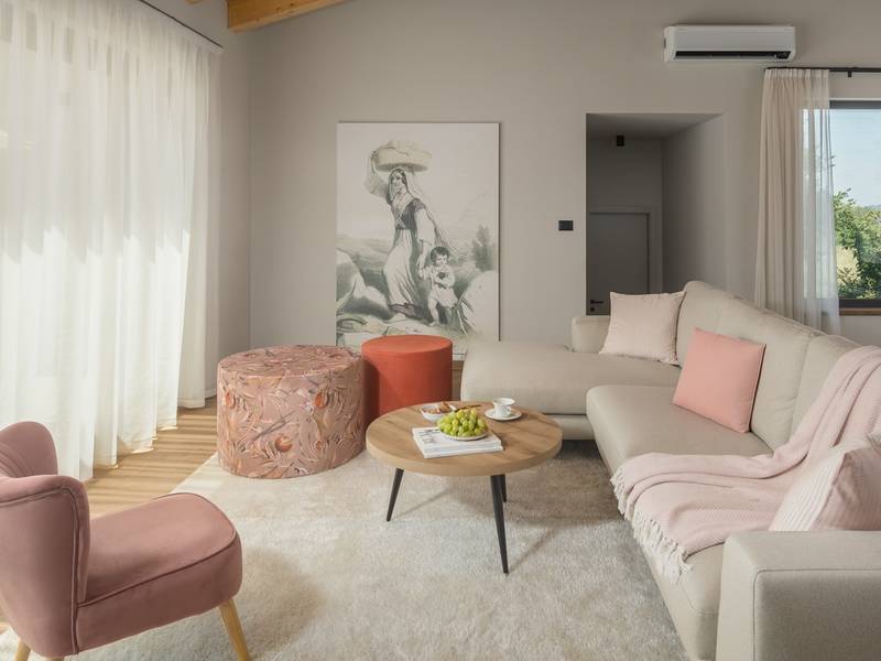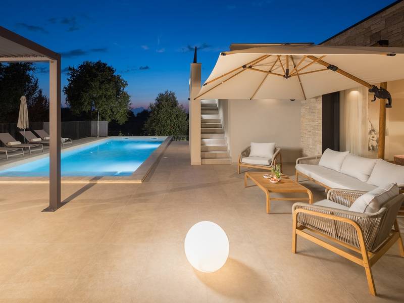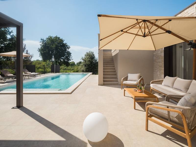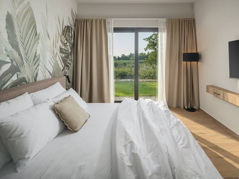 Luxury Villa Casa Maria, located in the peaceful village of Stancija Blek near Tar–Vabriga, Istria, combines historic charm with modern luxury. Surrounded by lush greenery and a spacious private garden, the villa accommodates up to 8 guests in four elegantly furnished double bedrooms, each with its own en-suite bathroom. The open-plan living area features large glass windows overlooking a 50 m2 private pool, seamlessly connecting indoor and outdoor spaces. Guests can relax in the jacuzzi, enjoy the outdoor shower, or unwind in the spa area with an emotional shower. A roof terrace offers stunning sea views, while private parking ensures convenience. The nearest beach is just a few minutes away, and local restaurants, cycling trails, and coastal promenades are easily accessible, making Villa Casa Maria an ideal destination for a luxurious and relaxing Istrian escape.