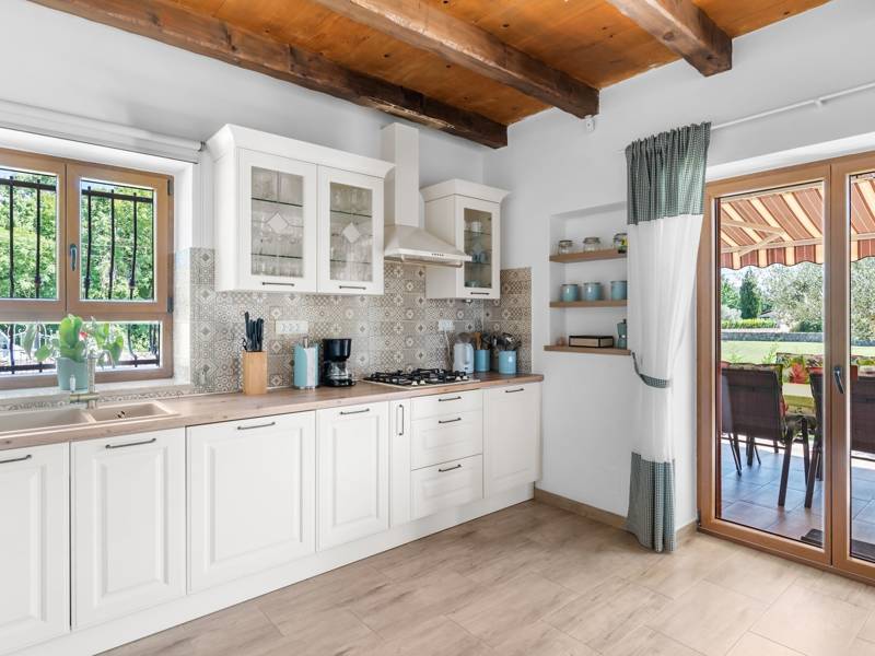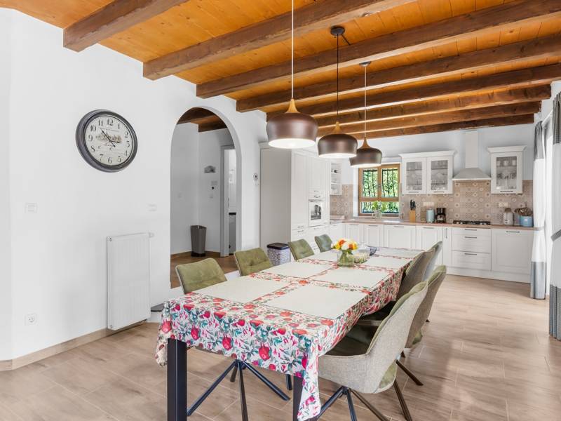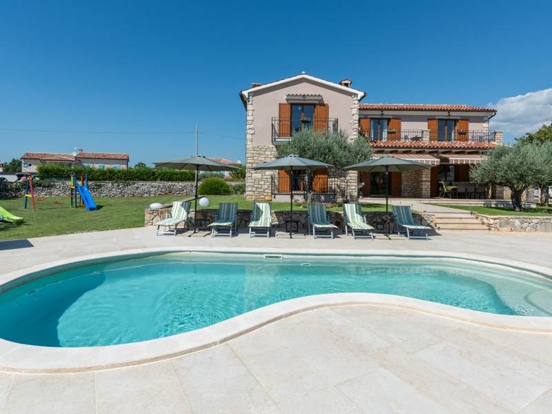Take a break from the everyday busy life, gather your loved ones, and treat yourself to a vacation in the enchanting Villa Marijanin Vrt near Tinjan. The villa can host up to 6 + 2 people, which makes it the perfect choice for a family gathering. This fully air-conditioned villa offers three beautifully decorated bedrooms with double beds, two en suite bathrooms with showers, and one en suite bathroom with shower and bathtub. On the ground floor of the villa, there is a fully equipped, modern kitchen for preparing delicious meals, which you can serve on the adjoining dining table. There is also a spacious living room with a fireplace and direct access to the yard, for pleasant moments spent in the company of loved ones. A pool table and a fitness room are also at your disposal. In the spacious, fully fenced yard, the first thing you will notice is the beautiful swimming pool with accompanying sunbeds and lounge area. There is also a covered fireplace with an outdoor dining table for 8 people. For additional fun, in the courtyard, you will also find a children’s playground, a trampoline, and a ping-pong table.