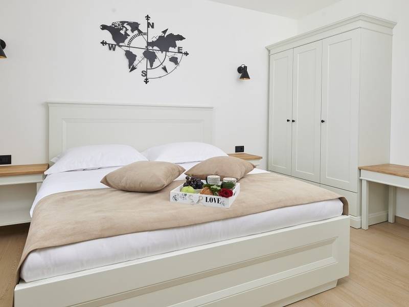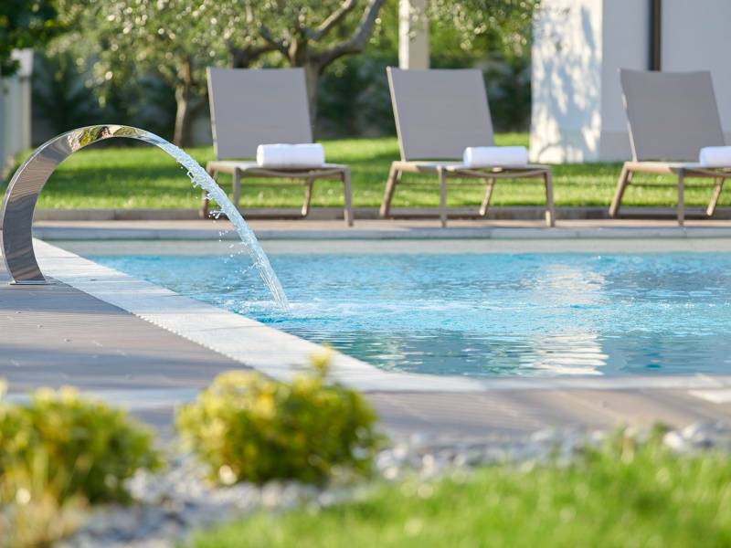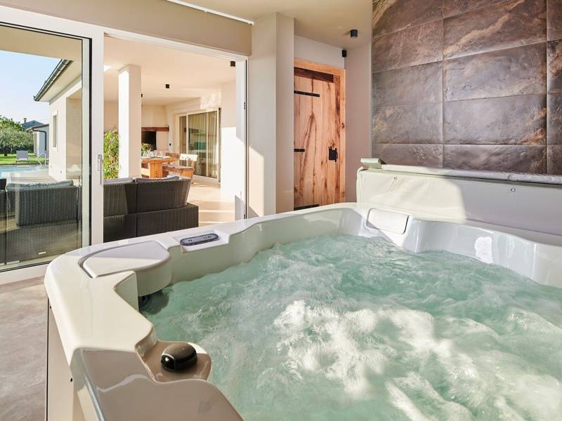 Experience pure relaxation and absolute tranquility on holiday in the Villa Grgo in Tinjan, central Istria. The spacious villa can accommodate up to 8 guests and guarantees quality moments for larger families or groups of friends. A cozy feeling of home awaits you from the moment you leave the cars in the private parking space and enter the air-conditioned villa. The top floor features two bedrooms with ensuite bathrooms as well as a view of the sea in the distance on a bright sunny day. Additional two bedrooms are on the ground floor, both with adjoining bathrooms. There is also a fully equipped kitchen, dining room, and living room with large glass doors which lead to the outdoor area.Beautiful landscaping is one of the highlights of the garden together with the hydromassage swimming pool and the mini-wellness area. Just imagine soaking in the sun on the loungers by the pool, relaxing in the jacuzzi or sauna, only to round off a perfect day with a barbecue out in the open. The newly-built villa is set in a quiet Istrian countryside, right in the heart of the peninsula. The village just outside Tinjan is conveniently near exciting places of interest such as Pazin and its famous Pit, the hilltop town of Motovun, Poreč on the coast, all of which are within 20 km of distance. The picturesque town of Rovinj is also nearby (35 km). Both the Slovenian-Croatian border crossing Dragonja and the Pula Airport are around 50 km away!