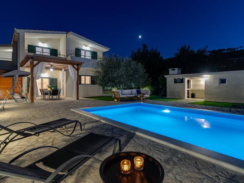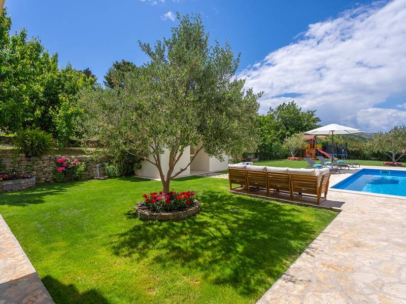 Villa ROKO with 4 bedrooms, 32 sqm heated pool, playground, and great surroundingsVilla Roko is a brand new and modern villa that perfectly fits families and friends for a relaxing holiday in unspoiled surroundings. The villa can accommodate up to 8 people in 4 very comfortable bedrooms with amazing nature views. The location offers absolute privacy in a quiet environment with open views of the valley and hills, with Mediterranean plants in the small village of Tugare. This villa provides a nice getaway from city life. Only 2 km from the minimarket, 3 km to the local restaurant, and 10km from sandy beaches in Omiš, Cetina river with many activities (rafting, zip-line..), and a 20-minute drive to the center of the famous town Split with its great historic attractions.Nicely organized interior (160sqm) on a private plot of 950 sqm offers comfortable 4 bedrooms, 2 family bathrooms, free WiFi, PS4, fully equipped kitchen and two dining areas, living room with TV, and outdoor dining area with the traditional barbecue, table soccer for fun and huge grassplot with trampoline, badminton net, wooden playhouse with a slide, a fun zone for your youngest. The interior is furnished with high-quality, nicely decorated, with carefully selected details, and all a modern guest might need for a very comfortable stay.*The ground floor offers an air-conditioned living room with sofas and a flat-screen TV, free WiFi, a comfy dining area for 8 pax with an exit to the outdoor dining area, a fully equipped kitchen with all you need for a very comfortable stay, microwave, a toaster, kettle, filter and espresso coffee machine, and a table with 4 chairs. Behind the kitchen is bedroom No. 1 which features a queen-size bed (160x200), ideal for kids, and includes a TV with PS4. There is also an exercise bike for your use and a family bathroom with a shower.* The internal staircase takes you to the first floor. It offers Bedroom No2 (A/C), Bedroom No3 (A/C), and Bedroom No 4 (A/C), each with queen-size beds 160cm x 200cm and each with a balcony with beautiful views of the natural environment. There is also a family bathroom with a bathtub, a shower, a bidet, a toilet, and a washing machine. * The outdoors is very spacious and offers so many different fun areas. The private heated swimming pool is 8m x 4m and is not overlooked, with a huge sun deck area with 6 deck chairs and 2 sun umbrellas. The covered outdoor dining area is in front of the living room and offers a wooden table for 8 and table soccer, a traditional barbecue area, an outdoor shower, and a spacious grassplot with several fun zones: a trampoline, a wooden house with a slide, the badminton or volleyball area with a net. The whole property is surrounded by carefully selected Mediterranean plants, flowers, and fruit trees, giving you a very nice, unspoiled, and fulfilling base for perfect and relaxed holidays.