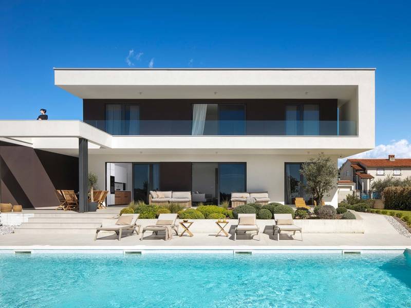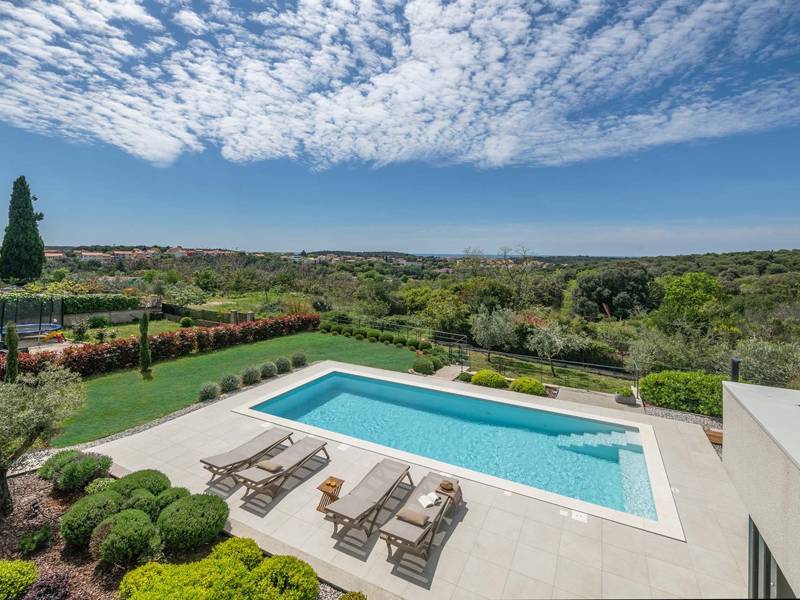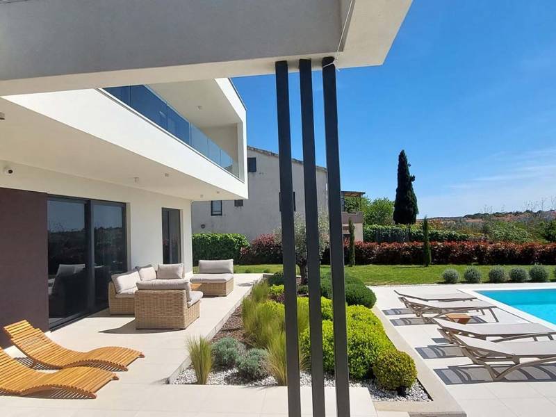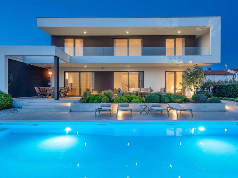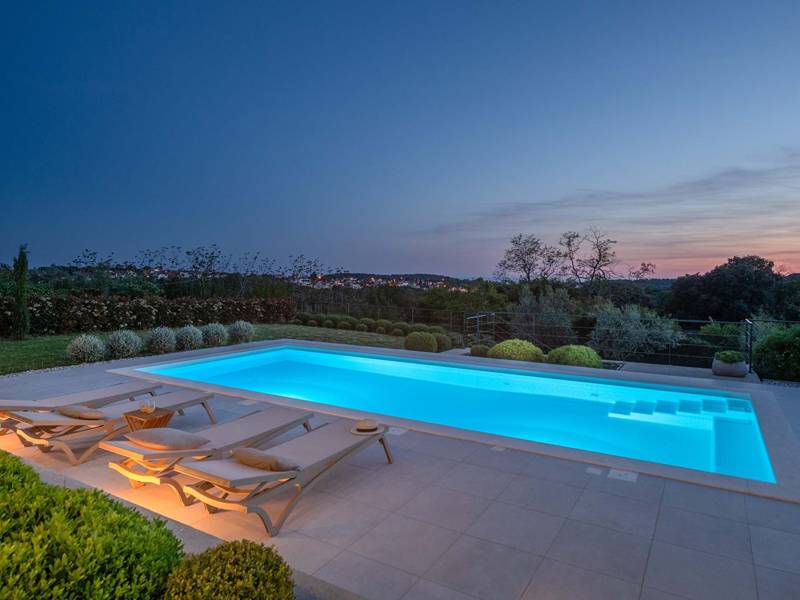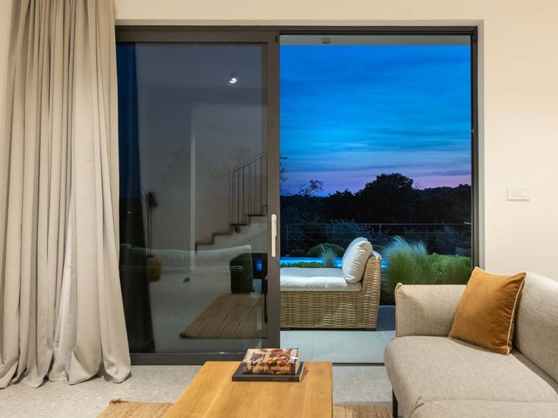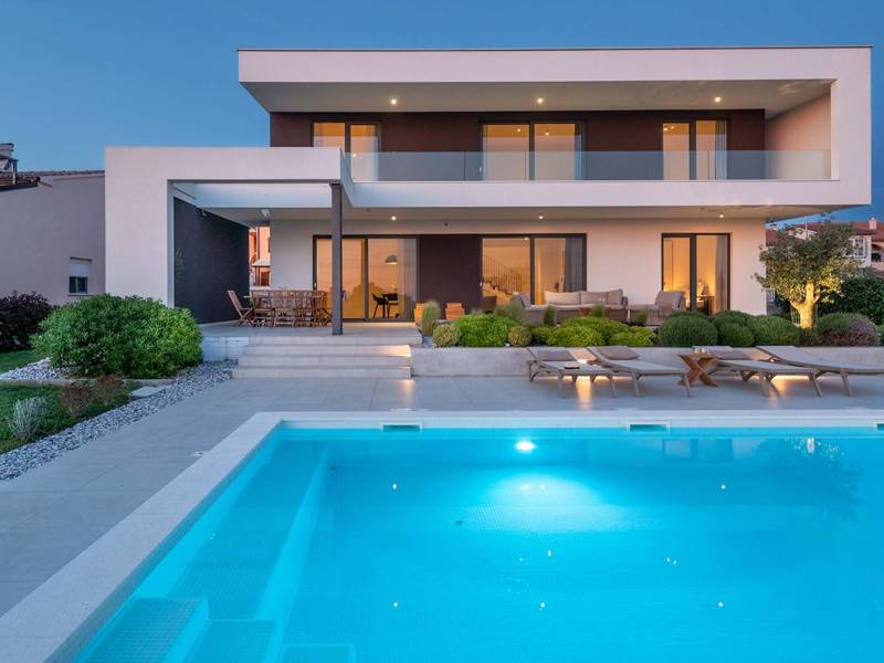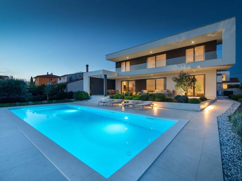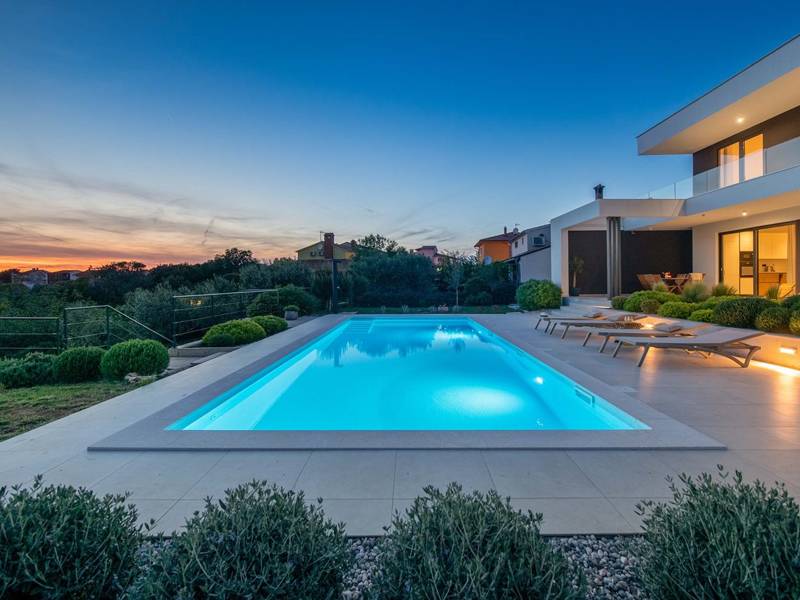 You will be amazed by the beauty and functionality of this modern beauty. It is in a small town near Pula, the largest city in Istria. The perfect location in a cul-de-sac with no traffic ensures constant silence. The villa is oriented to the southwest, and every room offers a beautiful view of the sea and nature. The modern interior will delight lovers of aesthetics. It consists of 4 bedrooms, each with a private bathroom. There are four bathrooms and an extra toilet and it is a proper choice for eight people. Each room has access to a spacious terrace that offers a unique view of the sunrise in the summer evenings. Villa is fenced so you have complete privacy. The outdoor area includes a large private hydromassage pool with salt water, an outdoor fireplace, a relaxation area, and a terrace. The nearest beach is only 600 meters away. Near are restaurants and shops. It is perfect for all lovers of a quiet vacation, in silence, and natural beauty, but it is also a perfect choice for adventurers. Nearby is Pula which offers a rich nightlife and various events, and on the other hand, there is beautiful Kamenjak. On Kamenjak you can see the remains of dinosaurs, many beach bars, beaches, and adventure bike trails.Some of the properties don’t allow youth groups. If you are booking an accommodation facility as a group of young individuals, contact our agency before making the reservation in order to check whether the requested property allows your stay.The minimum age for booking accommodation is 30 years.Groups under 30 years of age are not allowed.