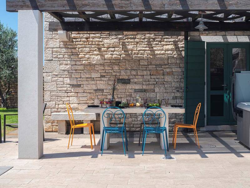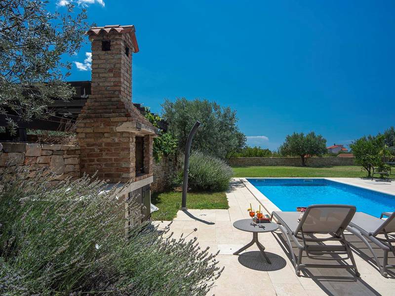 Villa Lucia is a newly built stone villa with an architecture style where the contemporary and traditional intertwine, which gives a graceful eye pleasing look. The accommodation capacity is enough for two families with a full comfort with all of the modern appliances, air- conditioning, 4 bedrooms with bathrooms, and another washroom placed in the ground floor. Two extra beds or cribs are available upon request, as is the baby feeding chair. The location of Villa Lucia is really good because it's in the quiet part of Vodnjan, a little town only a few kilometers away from the sea, and there is a wonderful sea view from the villa, as well as the islands Brijuni and the nearby city of Pula.Some of the properties don’t allow youth groups. If you are booking an accommodation facility as a group of young individuals, contact our agency before making the reservation in order to check whether the requested property allows your stay.