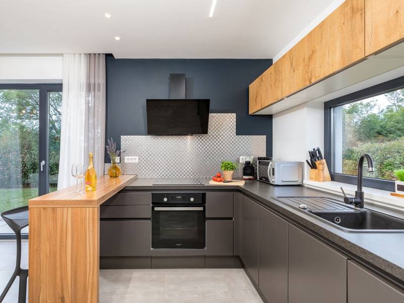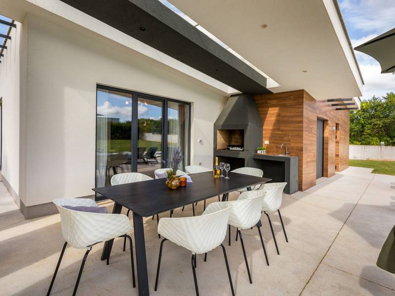 Centrally located Villa SaMa is the perfect base for exploring everything that Istria has to offer. It is located in a small village in central Istria, offering peace and privacy but close to popular tourist centers like Rovinj or Porec. This holiday villa features a very contemporary design with clean lines. The mix of concrete, wood, and large glass doors and windows create a chic luxury retreat.Modern and elegant furnished living room has an exit on the covered terrace with a BBQ and outdoor dining area, overlooking the pool. Here you can enjoy preparing fresh traditional meals or just relax with a glass of wine while your kids are playing in the children's playground. There is a total of 3 bedrooms in this house. Two bedrooms with double beds, one of which has an exit on the pool terrace, and one bedroom with two single beds. Each bedroom has a private bathroom with a shower. For families with kids, there are baby cot and a high chair available upon request free of charge.Pure luxury, comfort, and privacy characterize this 3 bedroom villa and create an unforgettable vacation experience.